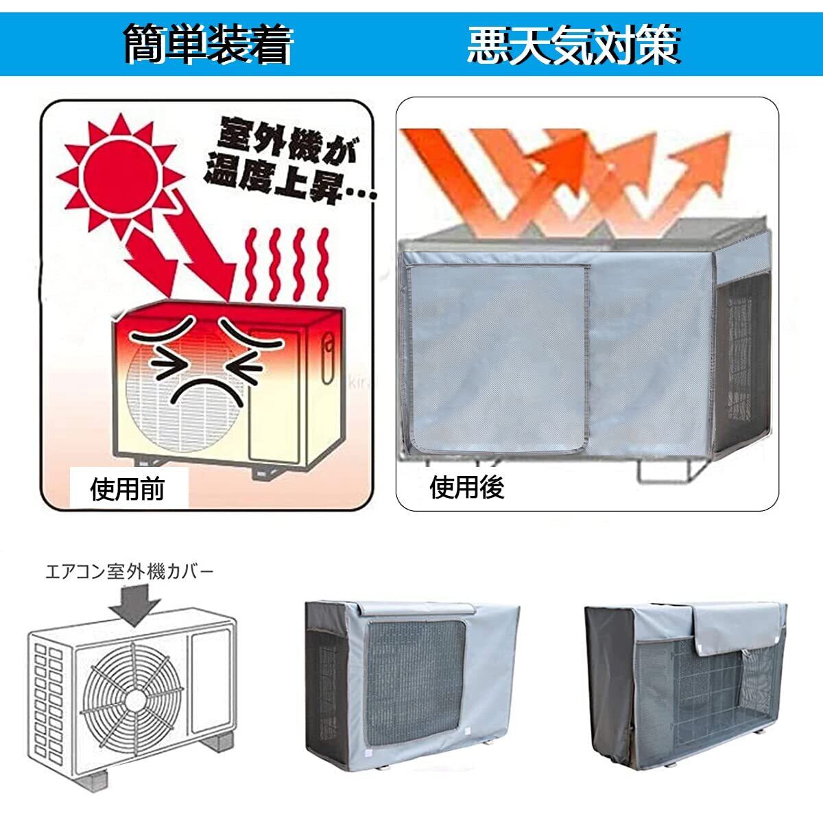 【悪天候対策】本室外機遮熱カバーは撥水加工生地を採用しているので、雨水を撥ね付け、泥やホコリなどがこびりつくのを防止できます。耐候性に優れているので、四季通用の素敵製品です。夏場や台風や、梅雨などの雨の季節には飛散した泥水や葉が室外機中に入り込むのを防ぎます。縛っておけば台風でも飛んで行かないし、寒冷地で積雪にも耐えて破損もしてないので堅牢性が高いです。エアコン必要がない季節はカバーも取り外し不要でとても便利です。 (ご注意事 項:室外機側面などの「通風孔」をふさがずにご利用ください。)