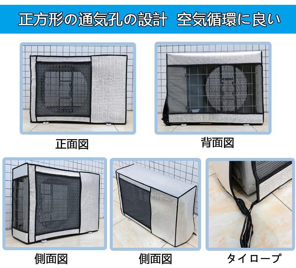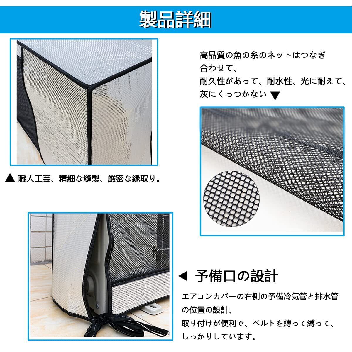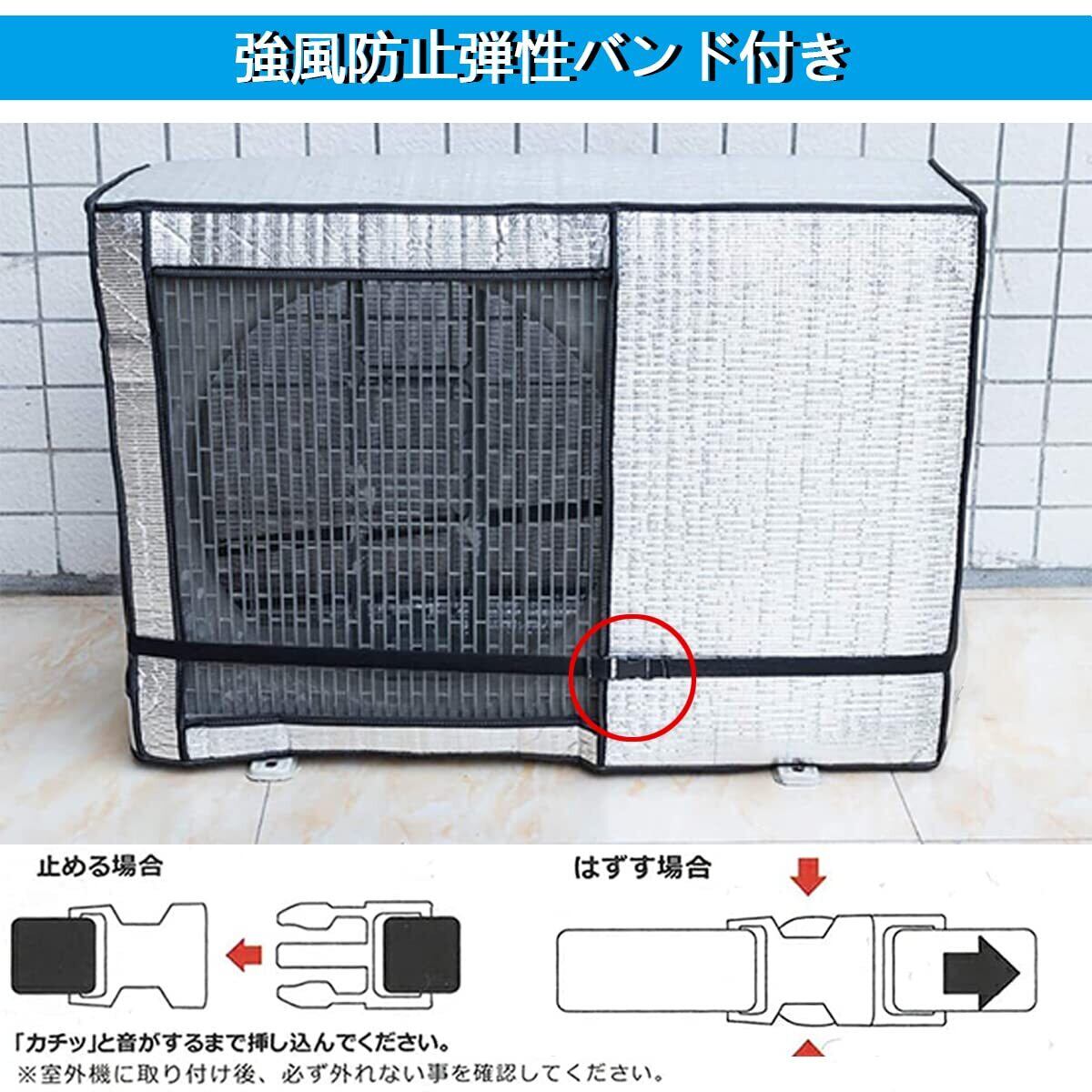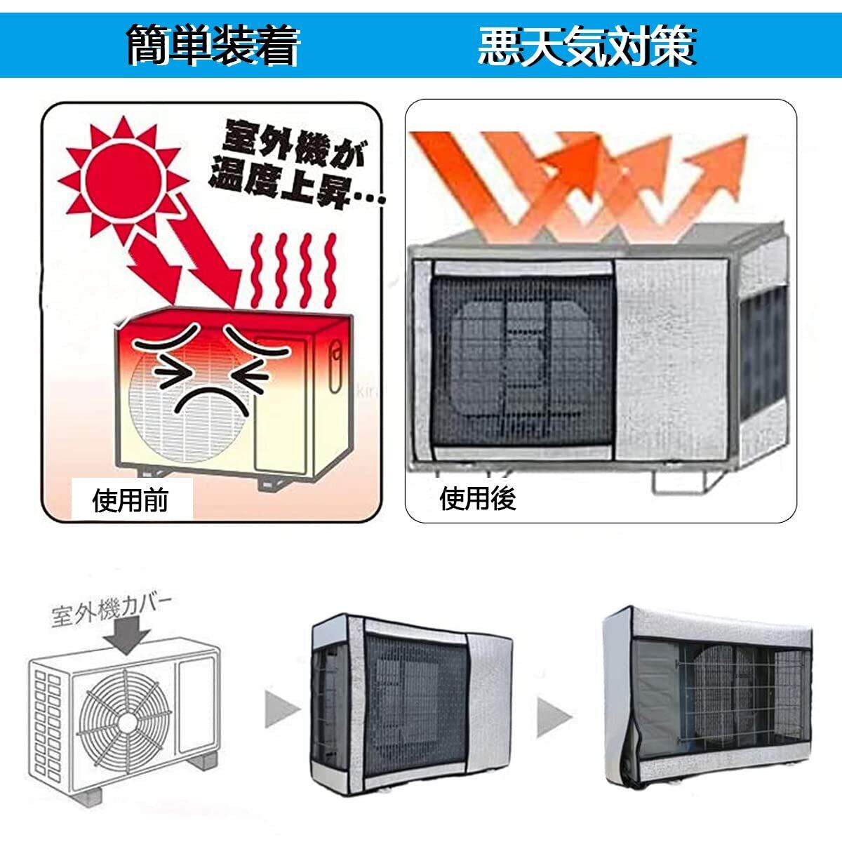 【固定用ベルト付き・オールシーズン適用】本室外機遮熱カバーは撥水加工生地を採用しているので、雨水を撥ね付け、泥やホコリなどがこびりつくのを防止できます。耐候性に優れているので、四季通用の素敵製品です。夏場や台風や、梅雨などの雨の季節には飛散した泥水や葉が室外機中に入り込むのを防ぎます。縛っておけば台風でも飛んで行かないし、寒冷地で積雪にも耐えて破損もしてないので堅牢性が高いです。エアコン必要がない季節はカバーも取り外し不要でとても便利です。 (ご注意事 項:室外機側面などの「通風孔」をふさがずにご利用ください。)