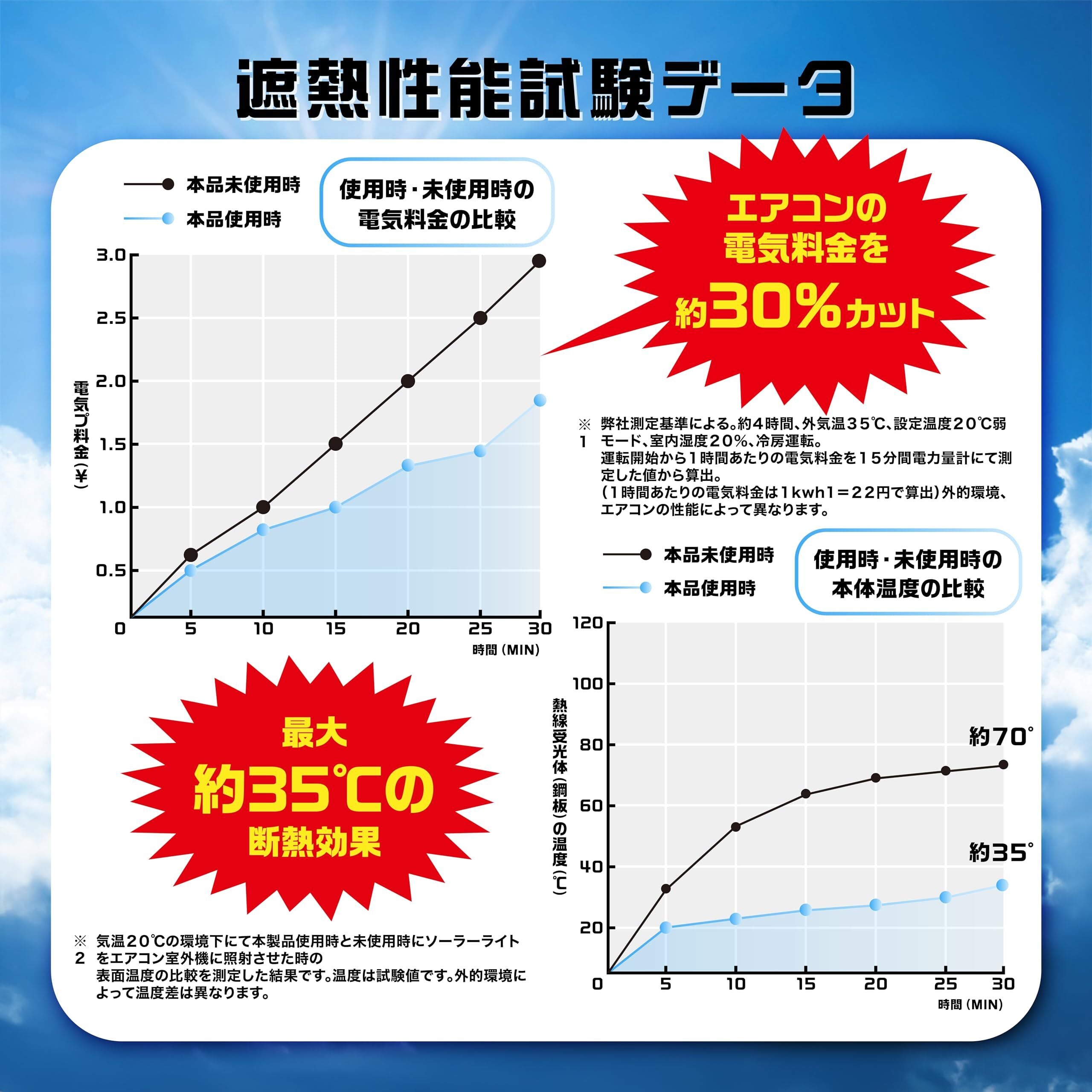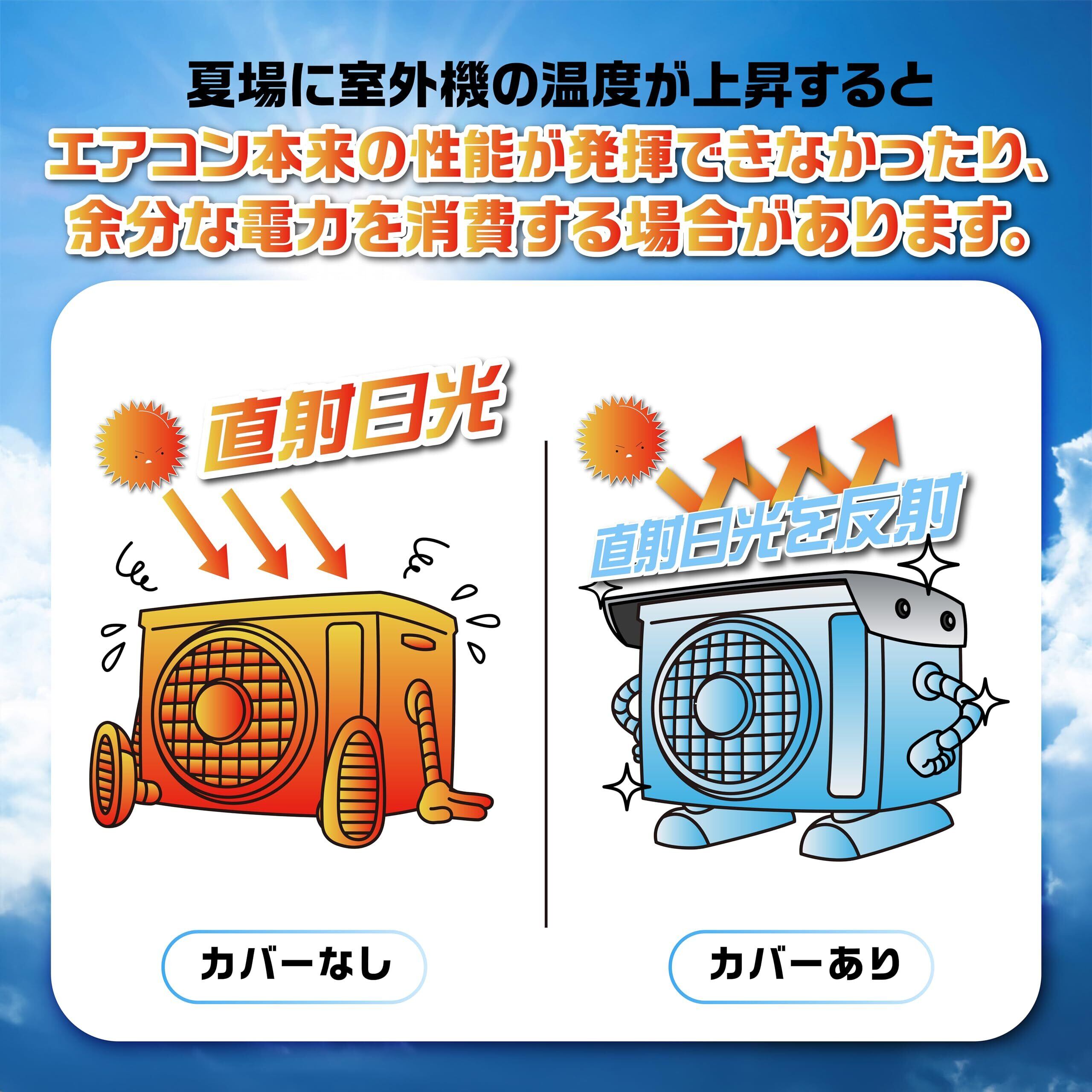 特徴:表面のアルミ反射素材により約40%の熱線をカット。空気層(気泡緩衝材)を中間層に採用。表面、裏面にアルミ反射素材で計3層の遮熱断熱構造で熱をエアコン室外機に伝えにくくなっております。 JIS規格の冷房負荷試験条件は43℃となっています。つまり日本のエアコン各社は外気温が43度まではしているということになります。 43℃を超えるとエアコン内の電子部品の熱が規格値をオーバーする場合があり、多くのメーカーで冷房能力が落ちるようです。猛暑時にエアコンの効きが悪くなる原因の一つとされています。 猛暑で直射日光が当たる場所の温度が40℃を超える日が増えると予想される中、エアコンの効きが悪くなる前、室外機の調子が悪くなる前に室外機にカバーをして直射日光を防ぐことをオススメします。またヒサシ付きなのでエアコン室外機の天面だけではなくサイドからの日光や反射を防いでより多く