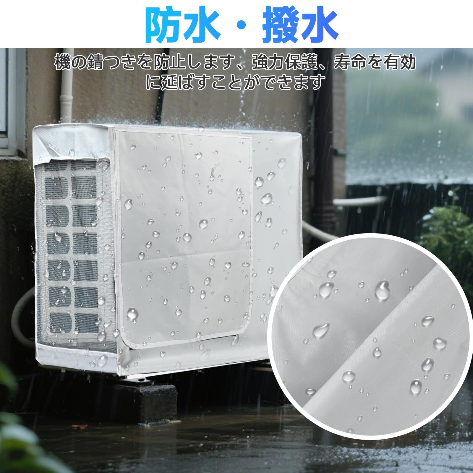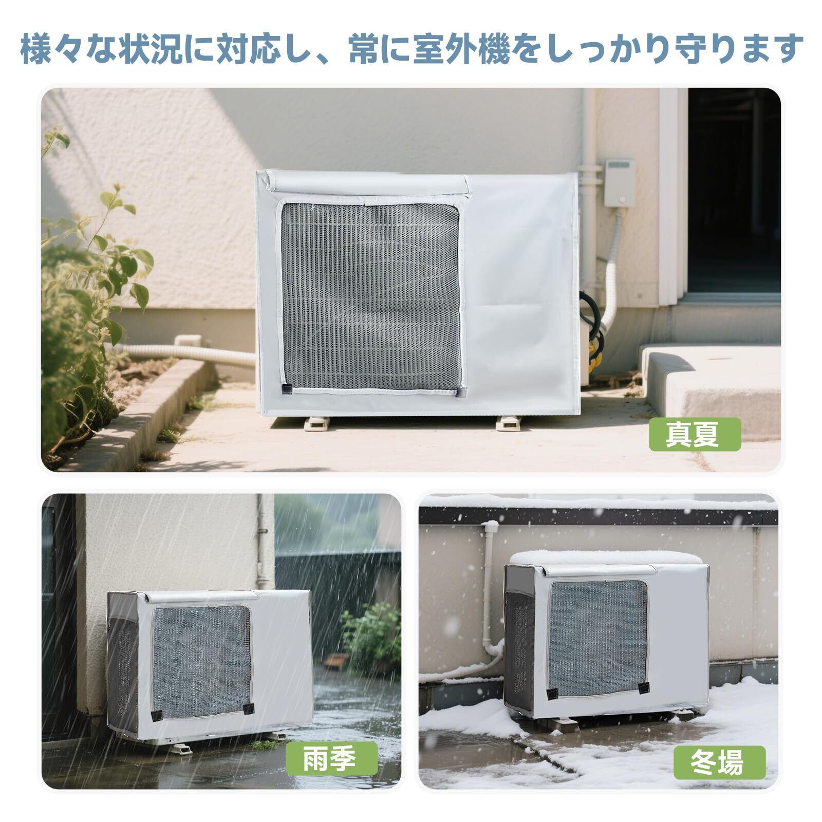 【過酷な環境から守る】このエアコン室外機遮熱カバーは撥水加工生地を採用しているので、雨水を撥ね付け、泥やホコリなどがこびりつくのを防止できます。直射日光、雨、雪などの過酷な環境から室外機を守ってくれ雨天でも快適に過ごせます。耐候性に優れているので、オールシーズンOK!台風や、梅雨などの雨の季節には飛散した泥水や葉が室外機中に入り込むのを防ぎます。