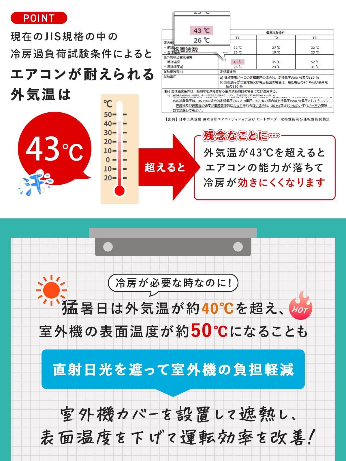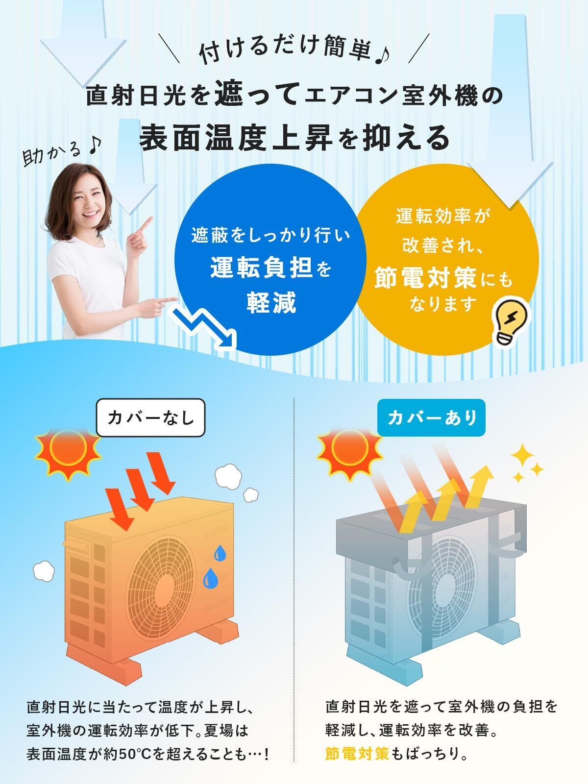 【節電・省エネ対策にも効果的】 室外機の表面温度が50℃を超える猛暑日でも、日差しを遮ることで負荷を軽減。冷房効率が向上し、電気代の節約や省エネ対策に貢献します。夏の節電アイテムとしてもおすすめです。