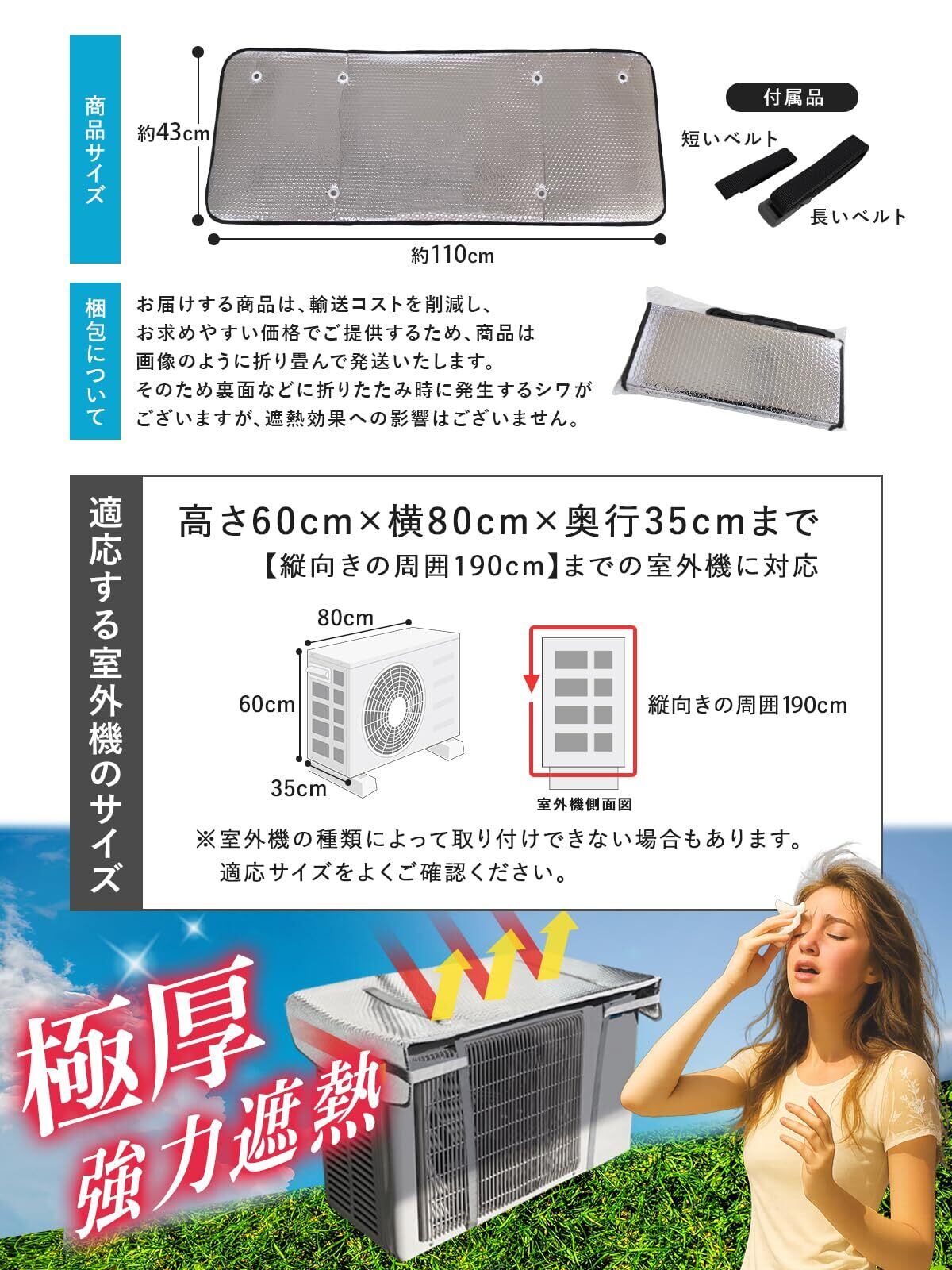 【使用時のご注意】 室外機のサイズ・形状によっては装着できない場合がありますので、必ず適合サイズをご確認ください。吸排気口をふさがないように設置し、作業時は必ず電源をオフに。バンドの無理な引っ張りにもご注意ください。