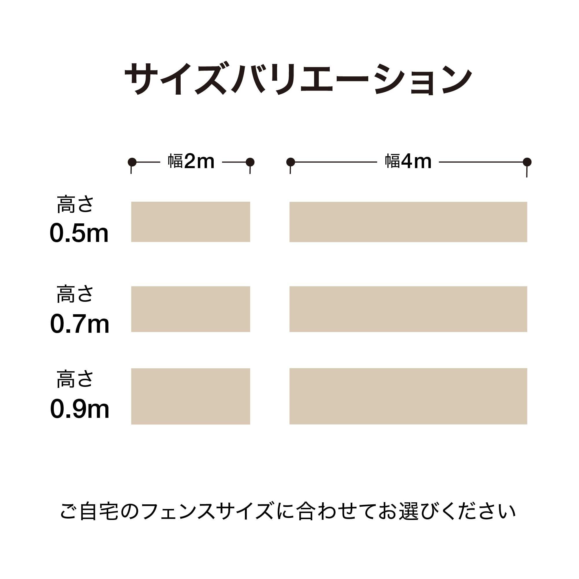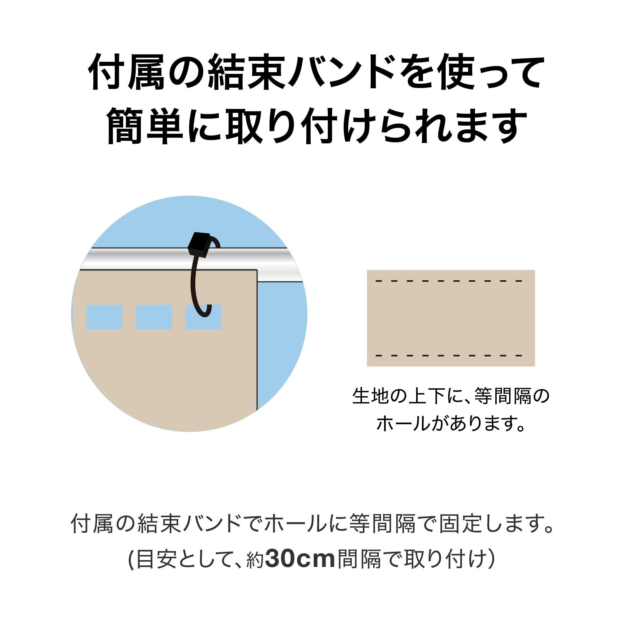ボタンホール仕様で取付簡単。快適さを損なわない適度な通気性。必要に応じたサイズにカットできる。生地の上下に、等間隔のホールがあります。 シェード生地だから適度な通気性があり、快適さを損なわず、風田によるフェンスへの負荷を軽減します。 生地をカットする際、縦向きにカットしてください。 カットした生地の端は補強のため、 2回折り込み、付属の結束バンドを用いて取り付けてください。境界フェンスはもちろんバルコニーフェンスにも隣家との境界の間仕切りに付属の結束バンドでホールに等間隔で固定。 目安として、約30cm間隔で取り付けてください。