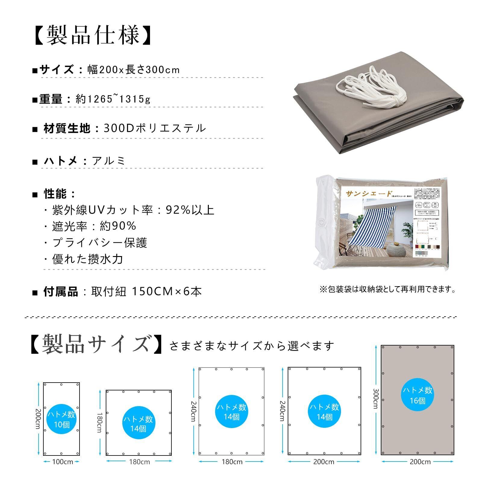 錆びないのゴールデンアルミハトメが付いているので、付属品:6本x1.5m取付けひも、ベランダや窓ペ、廊下、庭下、庭先、玄関などに簡単に取り付けることができます。お洒落なデザインなので、日よけだけでなく、ご自宅やお庭のエクステリアとしてもご利用なれます。
