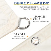 【四隅D環と四辺ハトメ有り 取付簡単】オーニングシェードの四隅では、高強度で錆びにくいスチールDリングを、ダブルステッチで丁寧に縫いこまれ、強い引っ張り力に耐えられます。四辺にもすべてアルミハトメが備わり、ハトメのはずれないようにウェビングを縫い込まれ、エッジの厚みを増します。全方位の固定可能によって、横でも縦でもサンシェード ベランダの設置するのが大変便利になります。加えて、長さ2mのポリエステルロープが4本同封され、お好きなレイアウトで自由に屋外 日除けをつけることができます。