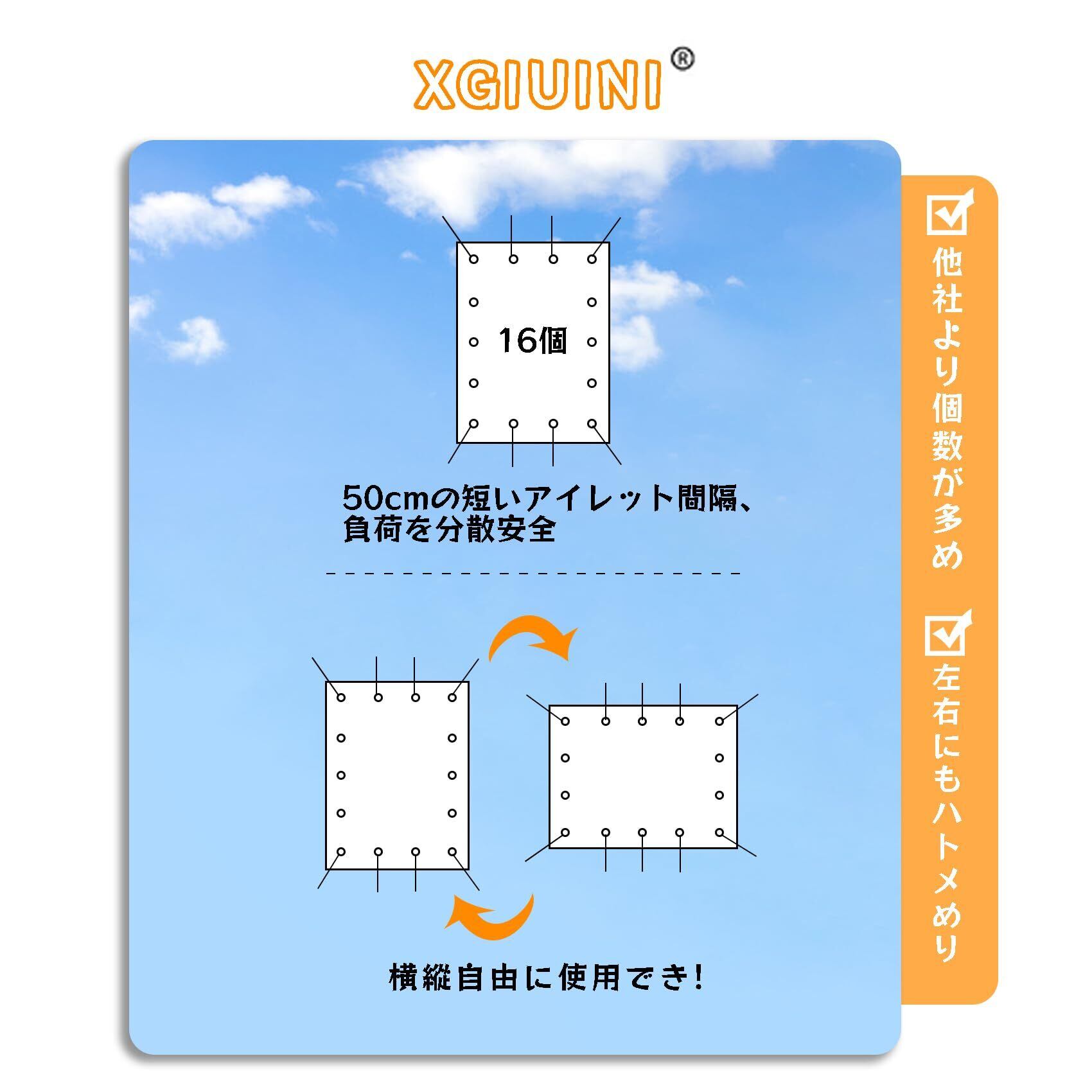 【高密度HDPE素材!耐久年数はおよそ3年!】のサンシェードは、通常の1.2倍厚みの生地を採用し、HDPEを100%使用しています。紫外線に強く色褪せにくい優れた耐候性。XGIUINI 改良版日除け シェードは、6層のヘミング、50cmの短いアイレット間隔、新しい補強されたコーナーなど、バージョンアップしています。 より高い引張強度を実現しました!より簡単に取り付けが可能です!オールラウンドな耐久性アップグレード!