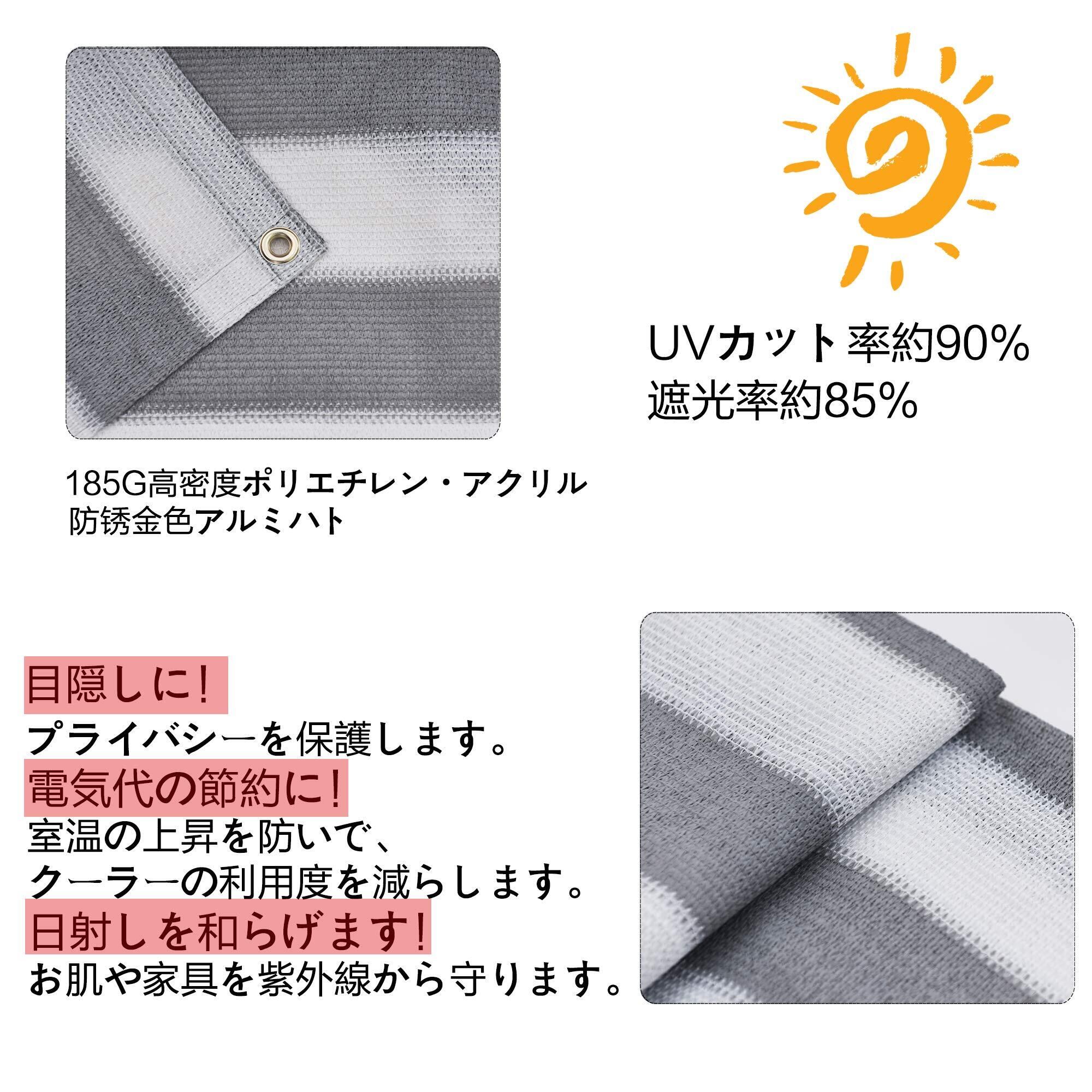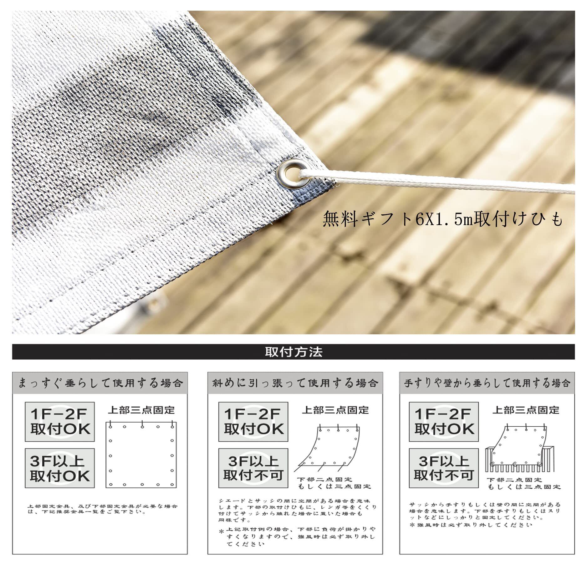 取り付け:錆びないのゴールデンアルミハトメが付いているので、付属品6x1.5m取付けひも、ベランダや窓ペ、廊下、庭下、庭先、玄関などに簡単に取り付けることができます。お洒落なデザインなので、日よけだけでなく、ご自宅やお庭のエクステリアとしてもご利用なれます。