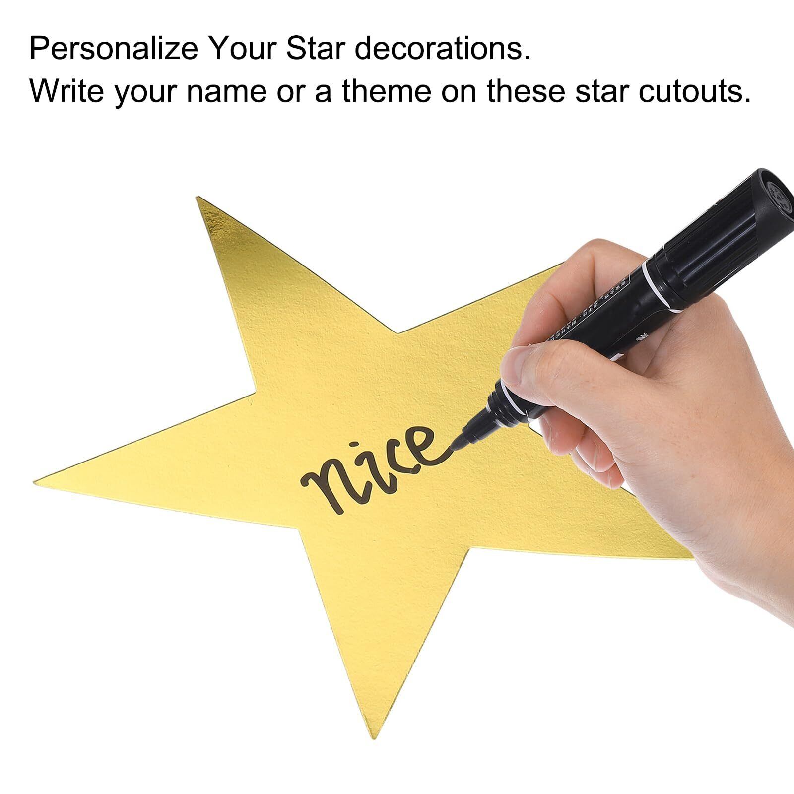 これらの星の切り抜きに名前やテーマを書いてください。簡単に書いたり、ドライイレースペンで消したりできます。防水表面。金スターパーティーの装飾に最適です。