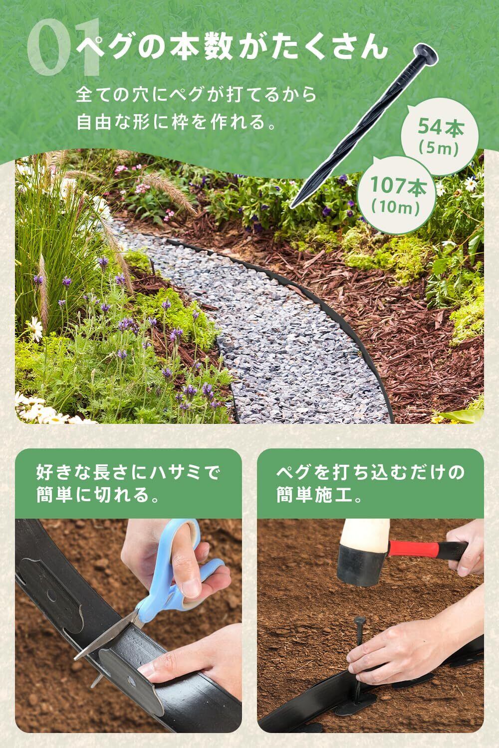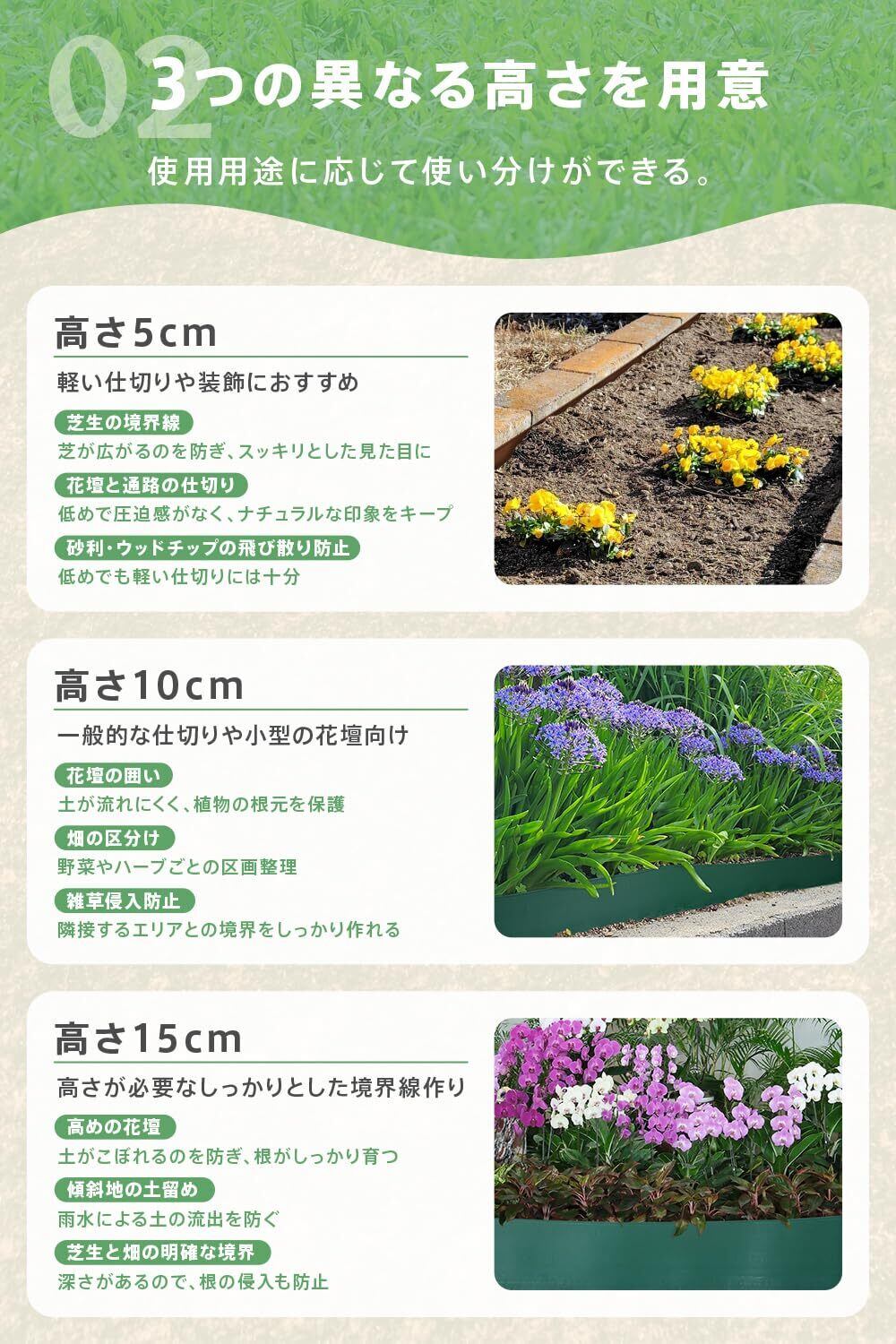 【選べる高さ(5cm/10cm/15cm)で用途にぴったり対応】 5cm:芝生と花壇の境目、砂利の仕切りに最適。目立たず自然な見た目。芝の広がり防止や、すっきりとした境界づくりにおすすめです。 10cm:家庭菜園、低木の花壇、小石やバークチップの飛散防止に。適度な高さで、植物や土をしっかりキープできます。 15cm:土の流出防止や、傾斜地の土留め、大きめの花壇・区画整理に。雨に強く、構造的な仕切りや高さのある植物にも対応できます。