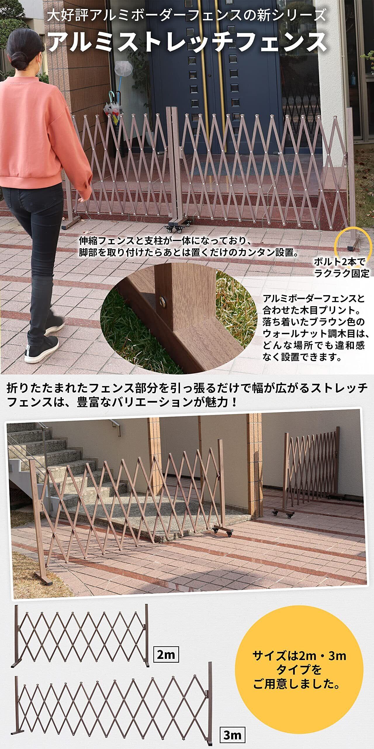 ガーデンガーデン アルミ 伸縮 ストレッチフェンス 幅2m 片側キャスター片側固定脚タイプ 木目調 アコーディオン 門扉 ゲート ALSF-1CAS-2M