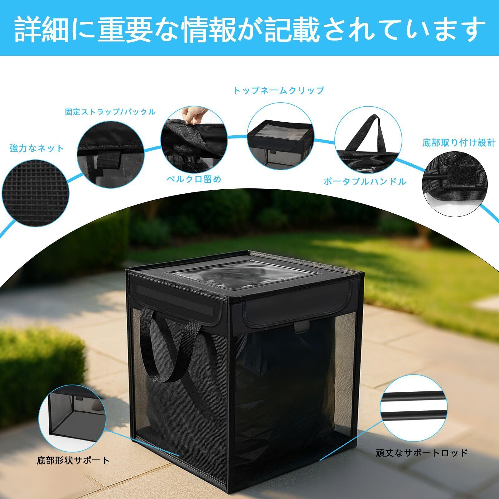 「SMART ELF」のゴミ収集ボックスは、カラス対策に悩む日本家庭のための機能性アイテム! の大容量でごみ袋を隠しつつ、高密度ネットでカラスや猫の侵入をブロック。 折りたたみ式で場所を取らず、軽量設計で女性でも簡単に設置可能。 防水素材と頑丈なフレームで、雨の日も安心して屋外で使用できます。 戸別回収エリアの整理整頓に最適な、暮らしをスマートにする収納ボックスです!