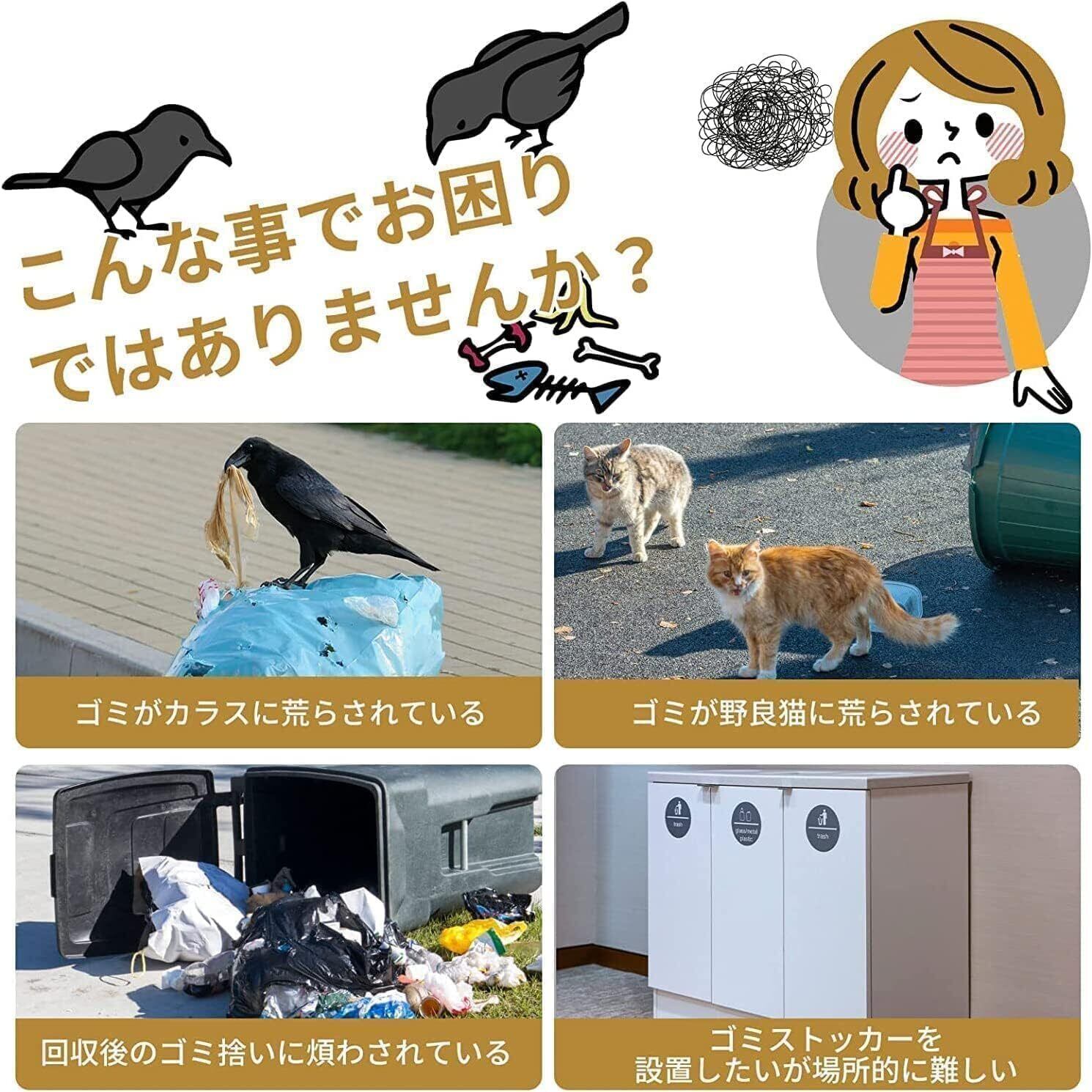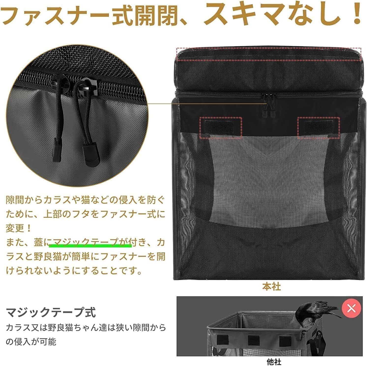 【ダブルファスナーで固定するタイプ】隙間からカラスや猫などの侵入を防ぐために、フタにはダブルファスナーを採用しています。また、蓋にマジックテープが付き、カラスと野良猫が簡単にファスナーを開けられないようにすることです。
