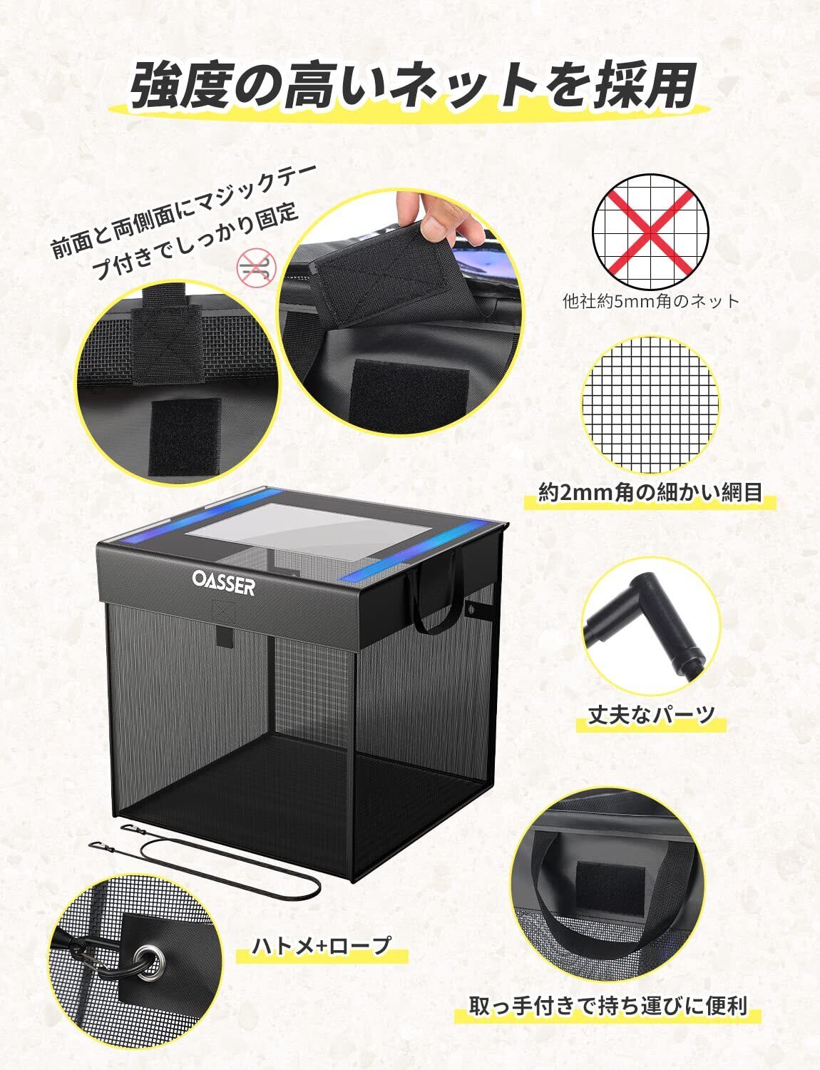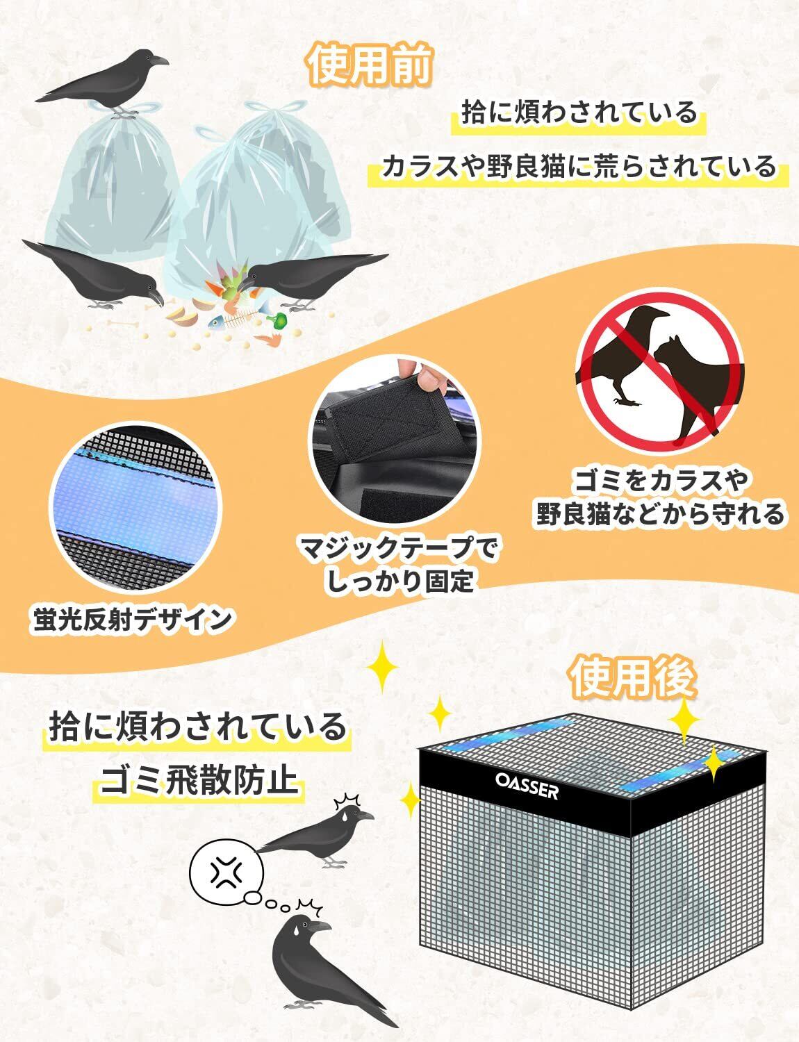 カラス除けゴミ箱:約2mmの細かい網目でカラスのくちばしが入りにくく、足に絡まりやすいです。マジックテープでしっかり固定し、頭のいいカラスや迷惑動物から家庭ごみや業務用ごみまで守れます。