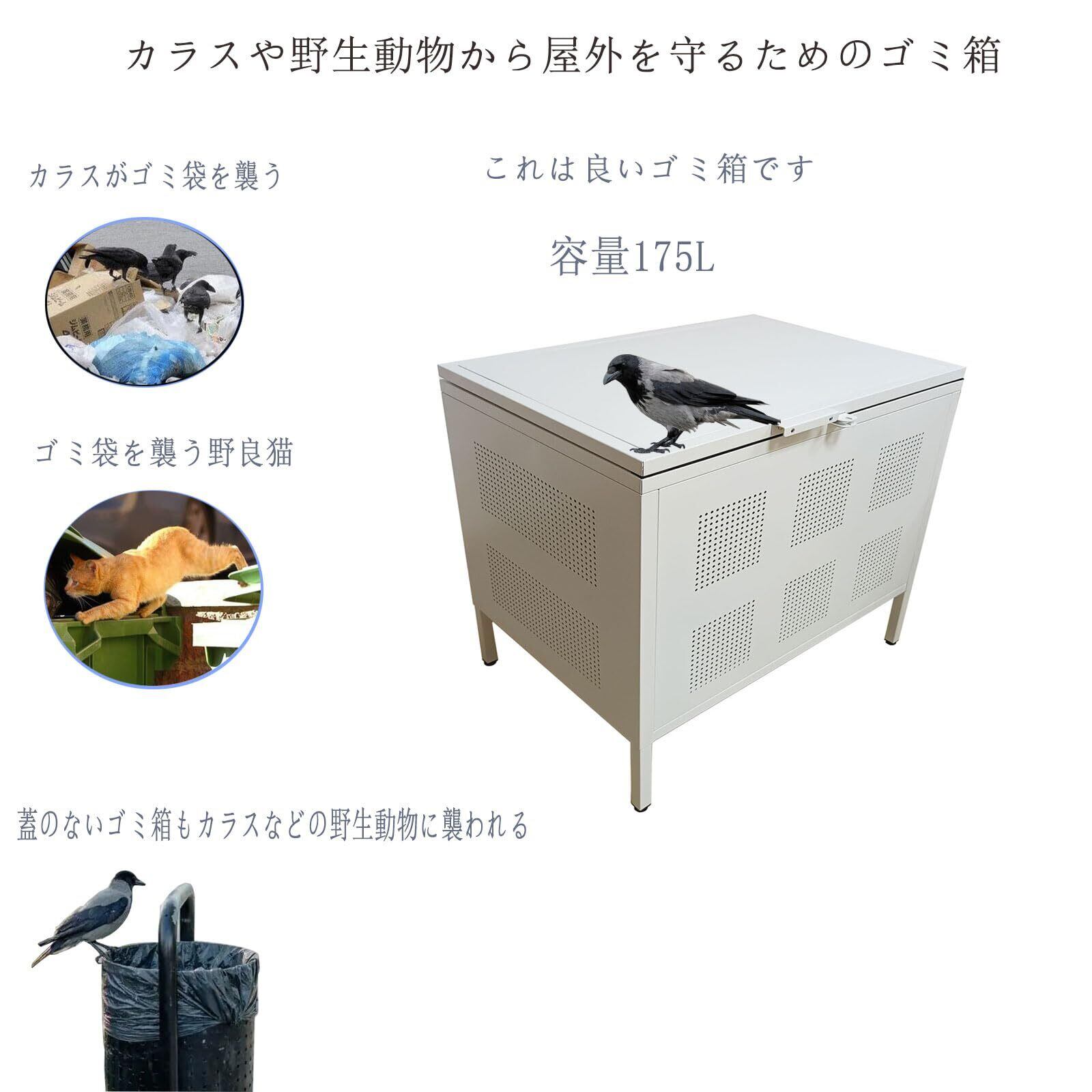 [カラスや野良猫対策]--蓋ができているゴミ箱なのでカラスや野良猫などの害獣に荒らされるストレスから解放でき、しっかりと閉じれるためゴミを散らされることを防止し。クチバシや爪での損傷の心配もありません。