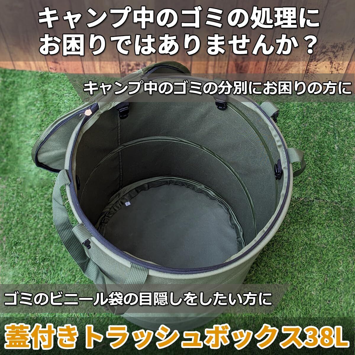 【人気商品】トラッシュボックス アウトドア キャンプ 蓋付き ゴミ箱 ダストボックス 自立式 ポップアップ式 折りたたみ 38L コンパクト 携帯 BBQ (グリーン)