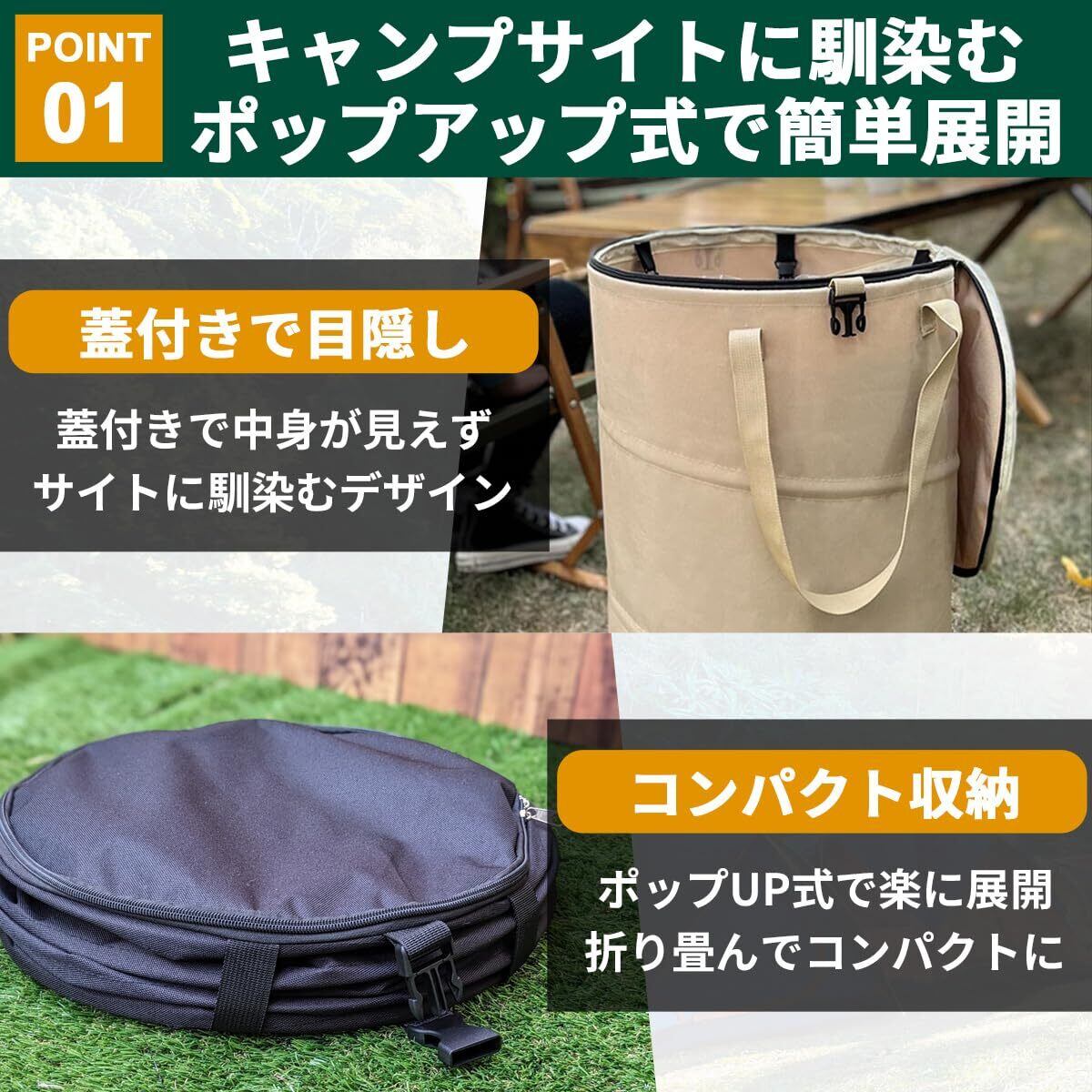 【テントサイトに馴染むデザイン】テントサイトに馴染むトラッシュボックス。蓋付きで中身が見えずキャンプ中の雰囲気を壊しません。生活感を出さずにゴミの処理ができるので、日常を忘れてキャンプを満喫できます。