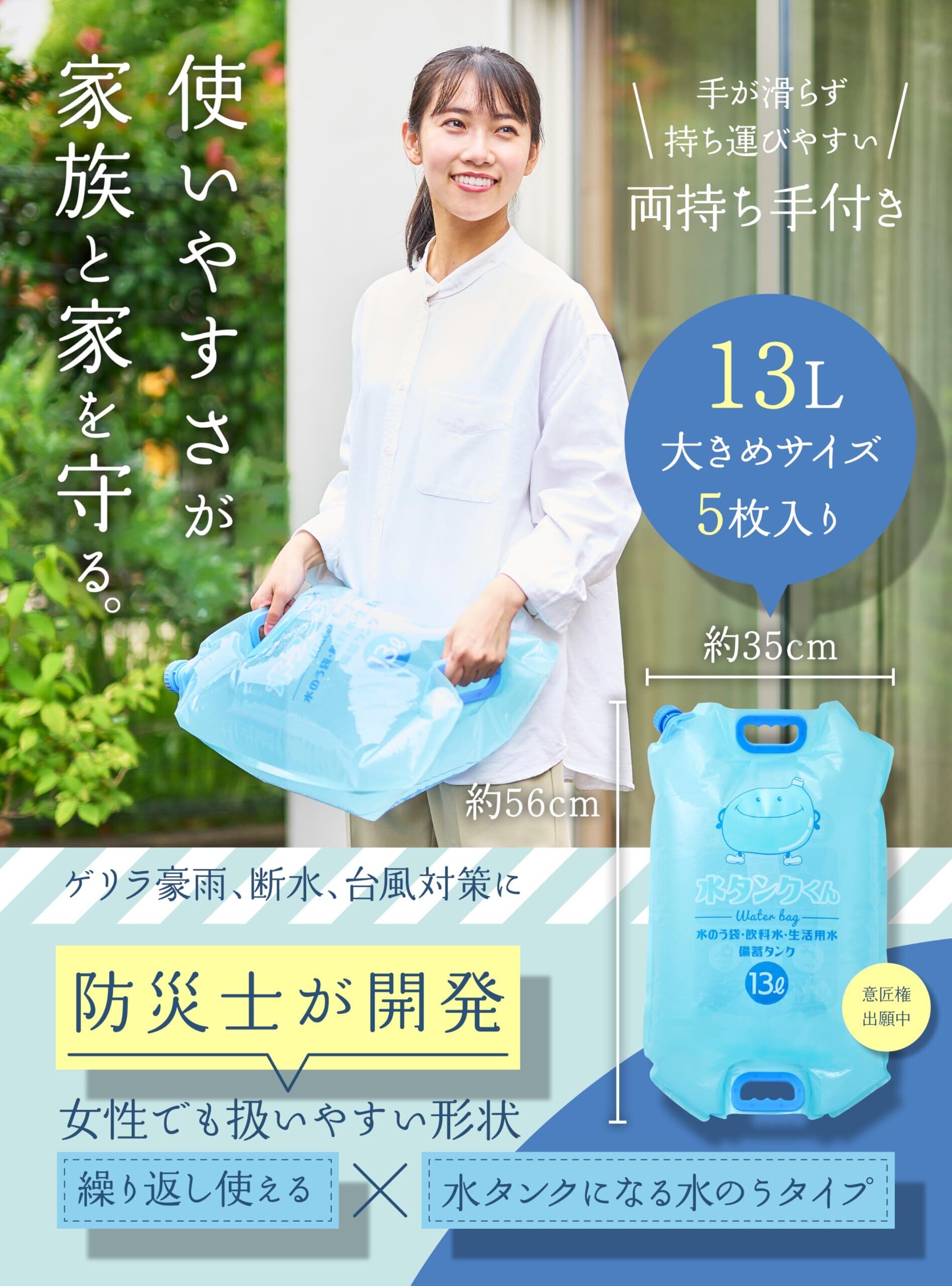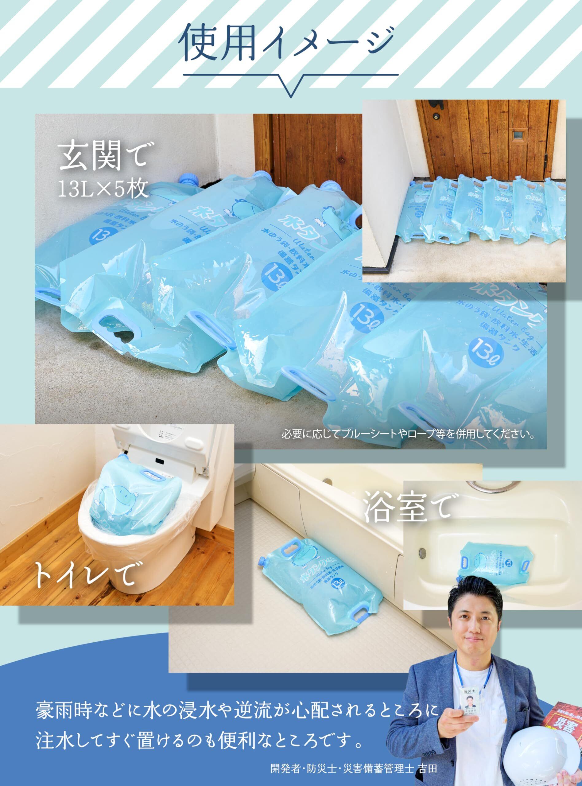 【食品衛生法試験 合格】 食品にも使える安心素材。防災備蓄の給水袋として最適です。 13L × 5枚入りだから、家族4人の生活用水(約3日分)に対応できます。