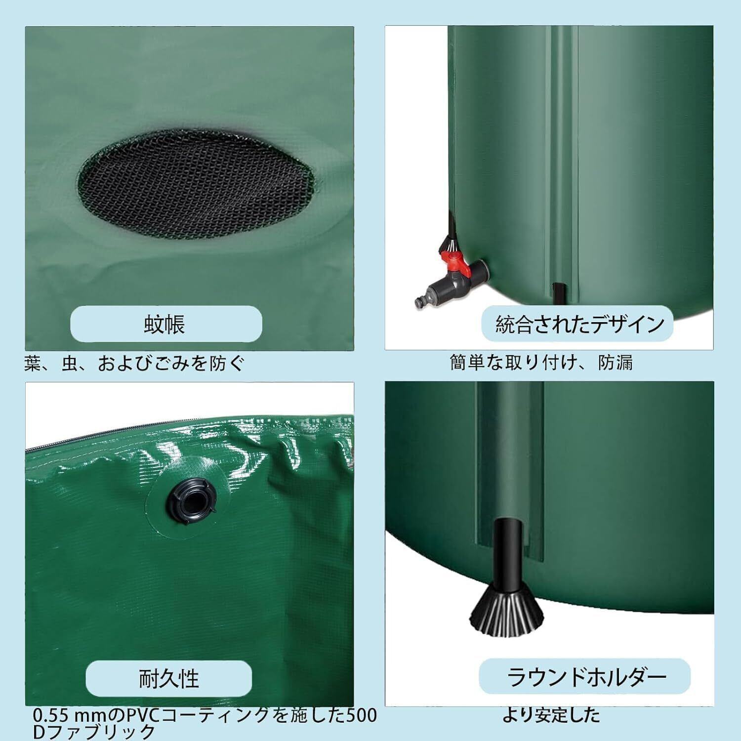 【耐久性と頑丈さ】耐久性のある3層PVC素材で作られた、の雨水タンクは、最も厳しい環境に耐える強さを持って設計されています。追加の安定性のために、我々の雨水 タンクには堅い棒が特徴で、ぐらつきや傾きの問題を効果的に解消します。