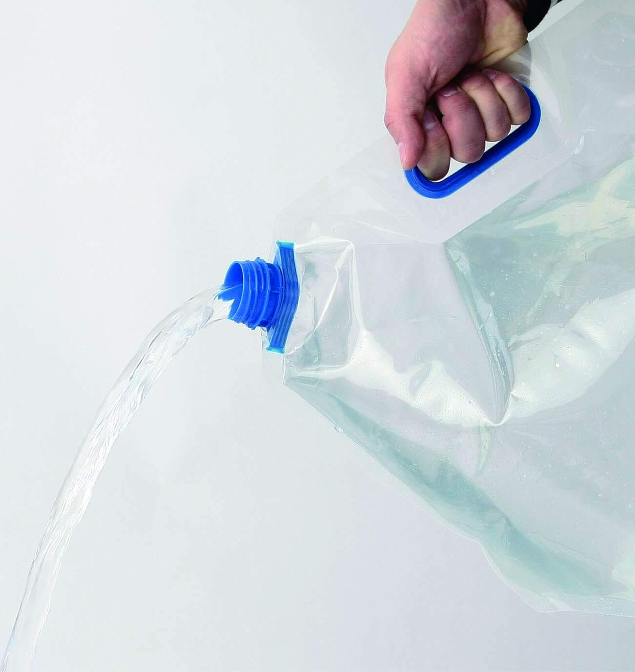 非常時の備えに便利な水タンク。水を入れると自立し、ハンドル付きで持ち運びも楽々。不使用時はたたんでコンパクトに収納可能