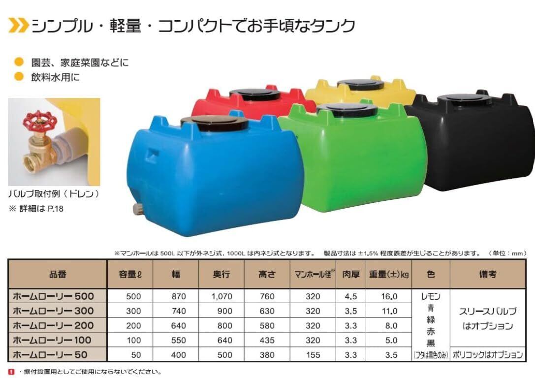 回転成形で強度抜群!! シンプル・軽量・コンパクトでお手頃なホームタンクロ-リーです。 農業・園芸・家庭菜園・防災用などに 家庭の生活用水や雨水タンクに!! タンク製品の使用上注意 ・薬品の運搬、比重が1.0を超えるもの、その他特殊な液体等をご使用の場合はお問い合わせください。 ・ご使用前に、必ず水張りテスト及び水洗いをお願いします。特にバルブ、ドレン口の水漏れが無いことを確認してください。 ・埋設用にはご使用にならないでください。 ・運搬時にはしっかりロープをかけて、マンホールはしっかり締めてください。 ・子供が近づかないような所に保管し、マンホールはしっかり締めてください。 ・エンジン、モーターなど発熱するものや排気ガスなどが直接当たらぬ様にしてください。 ・タンク本体の目盛りは目安としてご使用ください。 据付設置用としてご使用にならないでください。 ※マンホールは外ネジとなります。(フタは黒色のみ) ※製品寸法は±1.5%程度誤差が生じることがあります。(単位:mm)