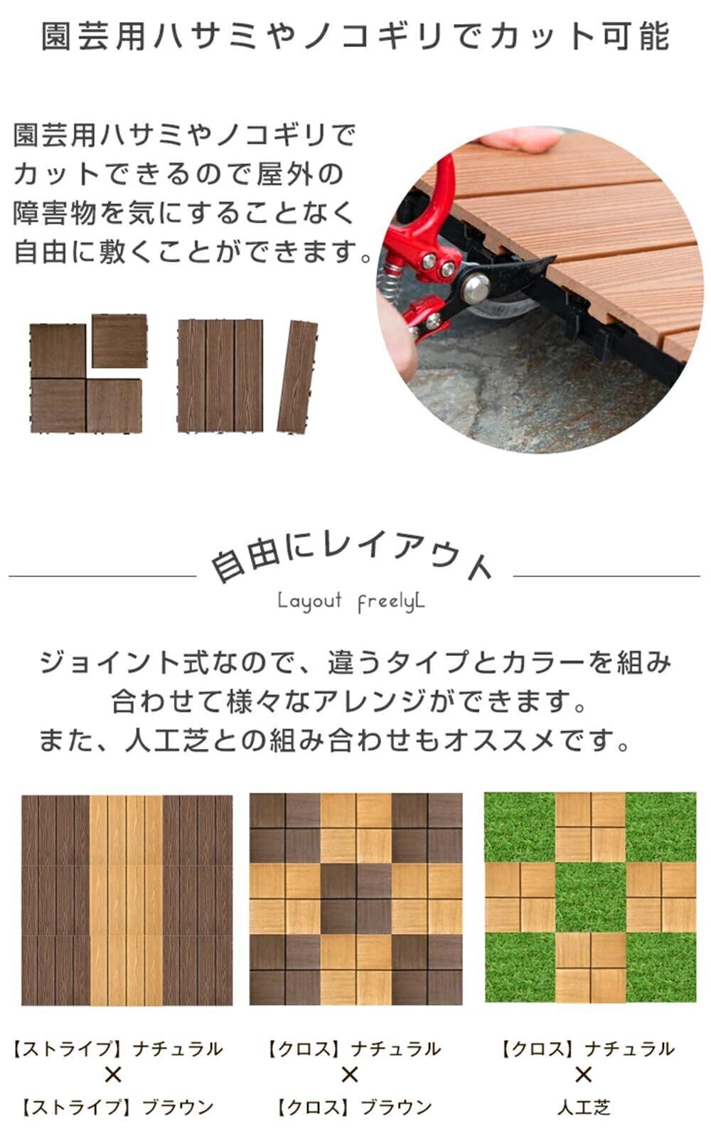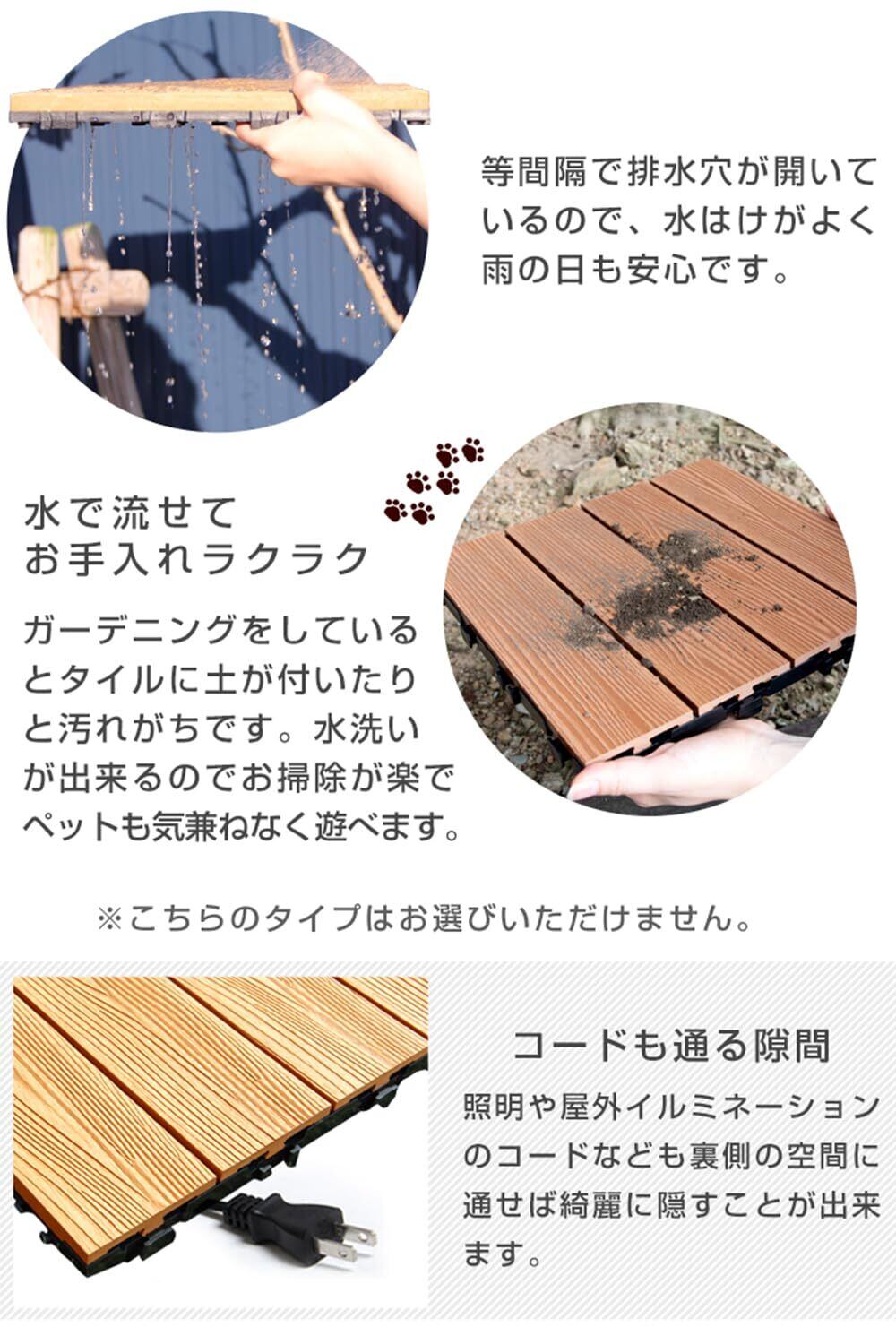 【生産国】中国 【温度】耐熱温度:60℃ 耐寒温度:-20℃【備考】※2023年9月13日より【ストライプ】タイプの仕様を一新しました。※木の繊維方向により、パネルの向きで色味が異なって見える場合がございます。 ※製品特性上、土台部分の熱膨張によりタイルが浮く場合がございます。設置時場所の周囲に隙間を開けて施工するようにしてください。隙間は約3m毎に1cmが目安となります。