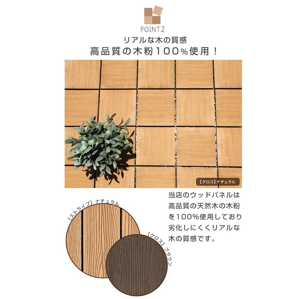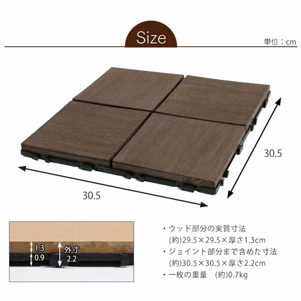 ※こちらは27枚セットです。【1枚あたりのサイズ】 ・本体部分の実質寸法: (約)29.5cm×29.5cm×厚さ約1.3cm ・ジョイント部分まで含めた全寸法: (約)30.5cm×30.5cm×厚さ約2.2cm【重量】【クロス】1枚あたり約0.7kg 【ストライプ】1枚あたり約1kg【耐荷重】1枚あたり約800kg【素材】土台:ポリプロピレン 天板:人工木<WPC(木粉45%入り)
