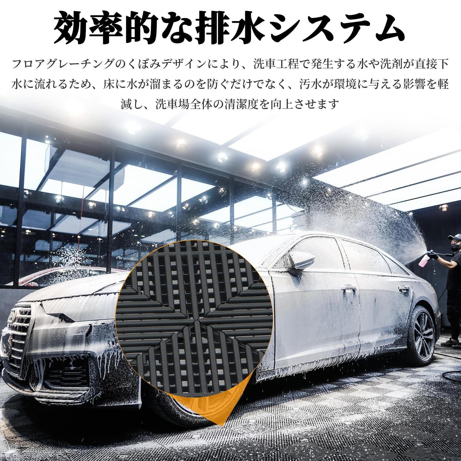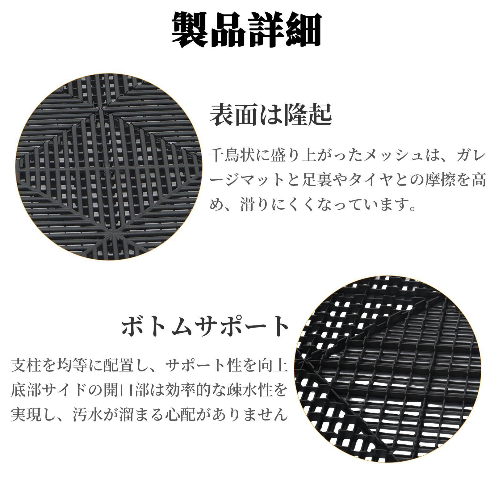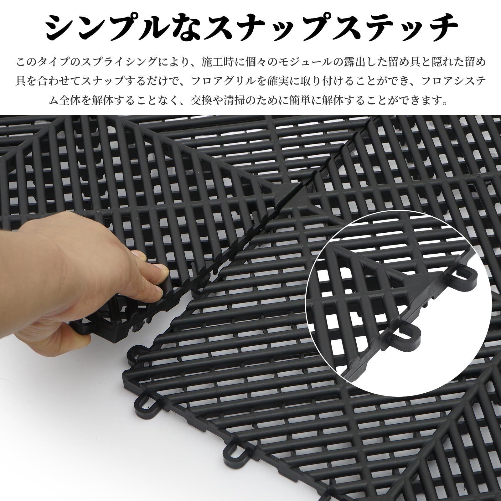 清掃とメンテナンスが簡単:オープン構造のガレージマットは、清掃が簡単で素早く行え、ポリプロピレン素材は、大型車の頻繁な出入りや高圧噴流の衝撃にも耐えることができます。 スナップオン式のモジュール設計により、施工中の敷設や交換が簡単です