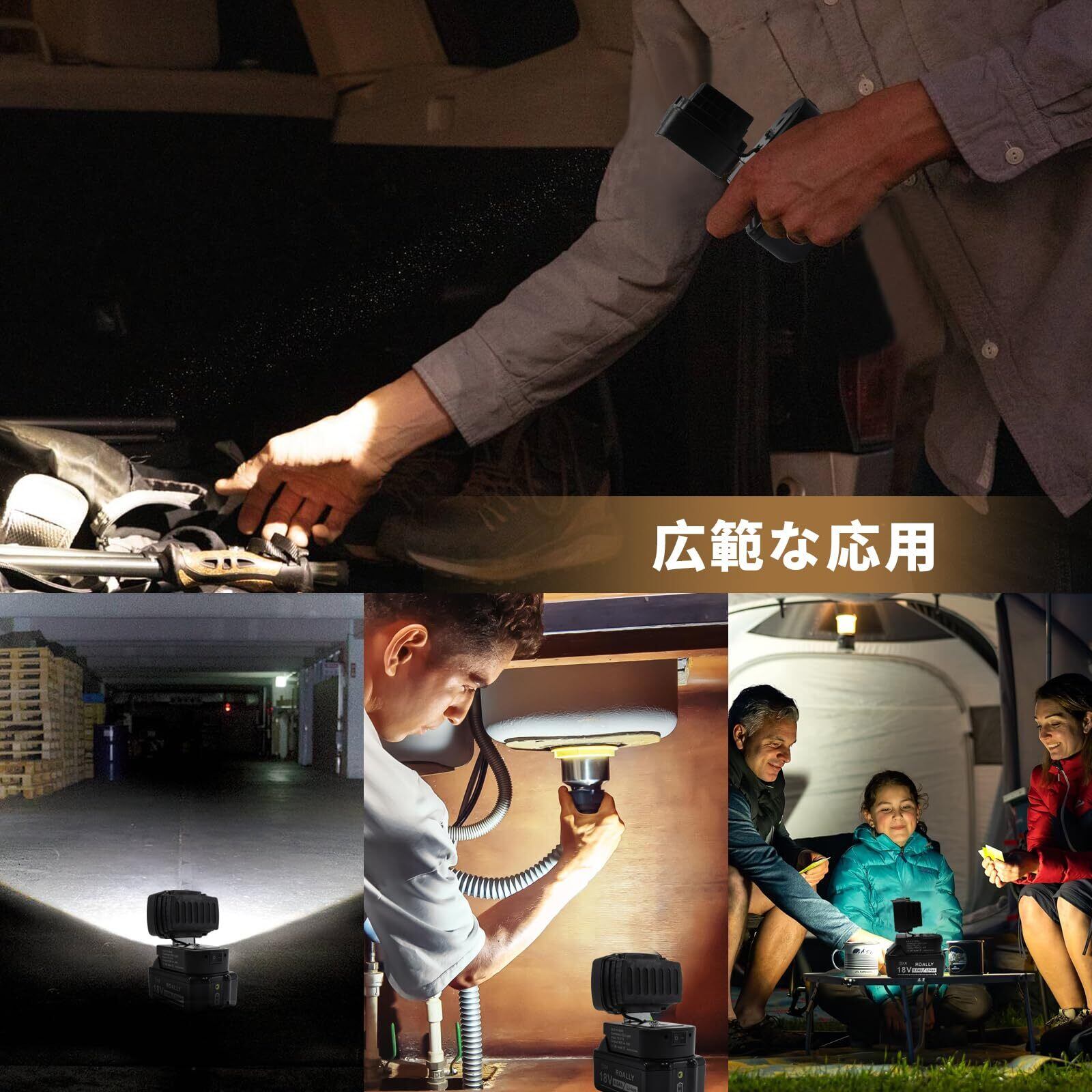 【使用範囲】作業灯はシンプルなデザインと黒いハウジングで、車や建設現場のメンテナンス照明だけでなく、家庭の照明、パーティーや庭の照明、キャンプや釣りのシーンにも適しています。