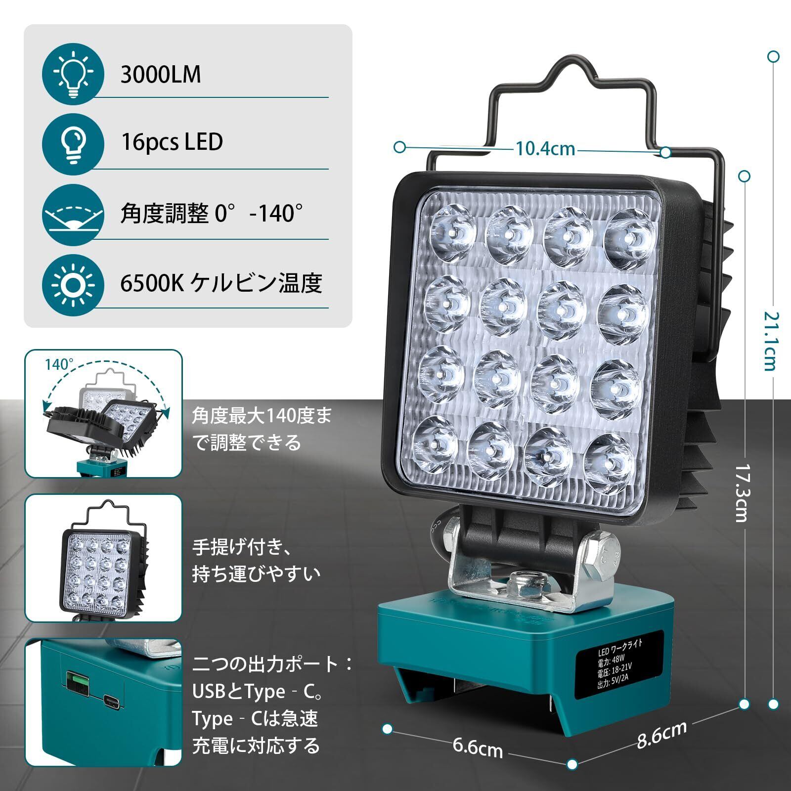 マキタ 18V 充電式 ワークライト LED フラッドライト コードレス作業灯 LED投光器 マキタ 18V バッテリー対応 48W 3000LM IP65防水防塵 手提げ付 スマホ充電 USB充電 Type-C充電 超高輝 携帯型 工事現場/非常用照明/屋外作業/キャンプ/登山/夜釣り/防災/停電に最適 軽量 日本語説明書(バッテリー別売り)