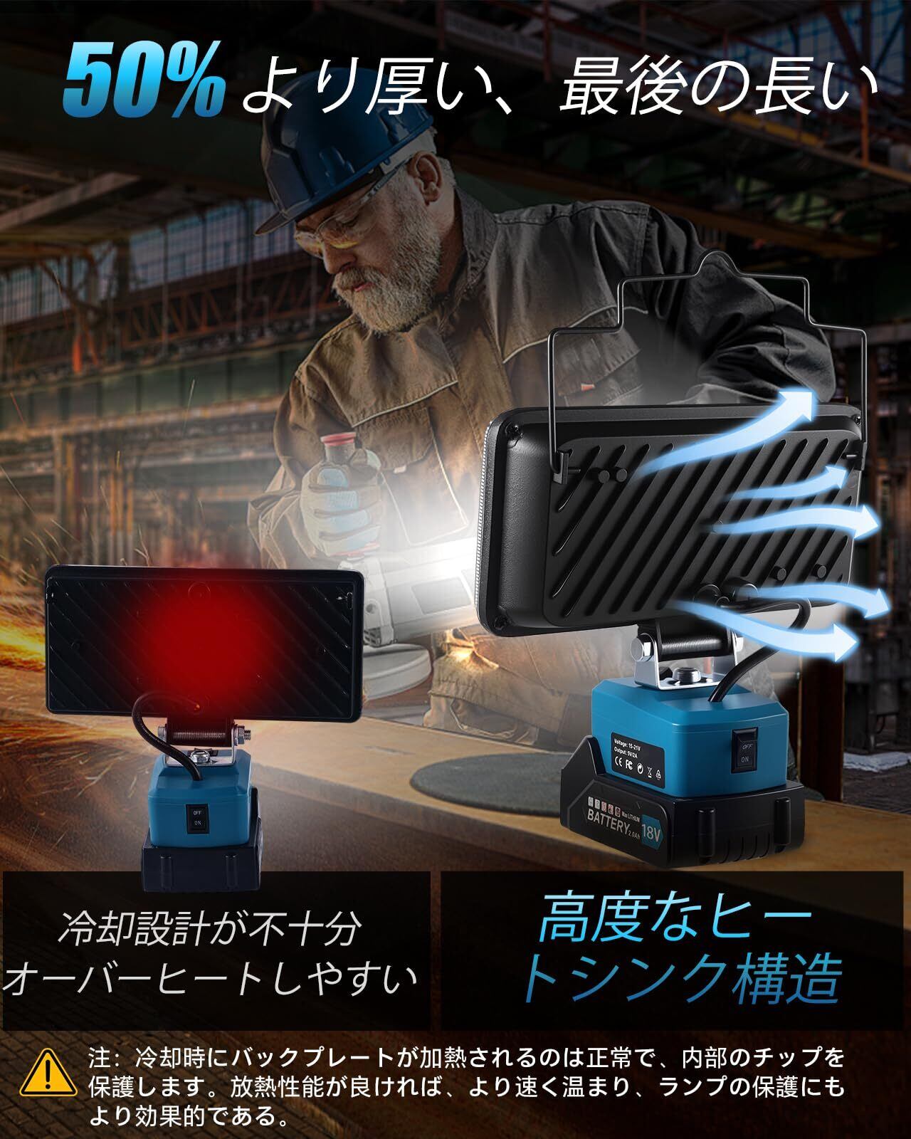高効率な冷却システム:優れた放熱設計で耐久性を確保 本製品は、一般的な同類製品の2倍の表面積と厚さを持つ大型ヒートシンクを採用しています。この優れた冷却システムにより、長時間の連続使用でもLEDチップの温度上昇を抑え、製品の性能劣化を防ぎます。これにより、安定した明るさを保ちつつ、製品自体の長寿命化を実現しました