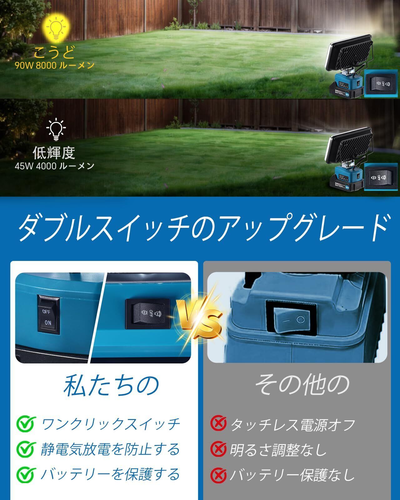90W/8000LMの圧倒的な明るさ:超高輝度・コードレスLED作業灯,最大8000ルーメン、90Wの高輝度LEDチップを搭載し、広範囲を均一かつパワフルに照らします。ライトヘッドは前後140°の広範囲で角度調整が可能。作業現場の全体照明から、特定の対象物を照らすスポット照明まで、ニーズに応じた最適な光を提供します。明るさは2段階(100%/50%)で調整可能です。
