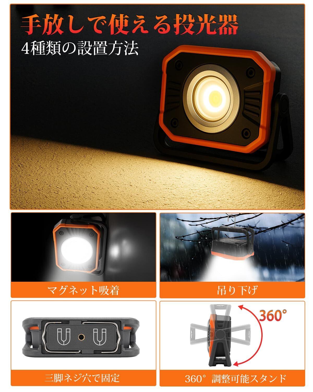 【人気商品】【防災対策】北澤商事 4段階調光・調色 LED投光器 高輝度 COBライト LED作業灯 USB充電式 モバイルバッテリー機能 充電式投光器 折り畳み 強力マグネット ワークライト フック付き 三脚穴付き cob作業灯 360°回転 IP66防水 小型軽量 懐中電灯機能 夜間作業 キャンプ 夜釣り アウトドア 夜間工事 車中泊 登山 停電対応 防災 地震対策 小型軽量 PSE認証済