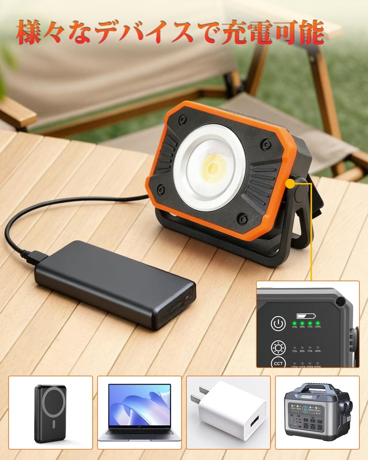 【防災対策】北澤商事 4段階調光・調色 LED投光器 高輝度 COBライト LED作業灯 USB充電式 モバイルバッテリー機能 充電式投光器 折り畳み 強力マグネット ワークライト フック付き 三脚穴付き cob作業灯 360°回転 IP66防水 小型軽量 懐中電灯機能 夜間作業 キャンプ 夜釣り アウトドア 夜間工事 車中泊 登山 停電対応 防災 地震対策 小型軽量 PSE認証済