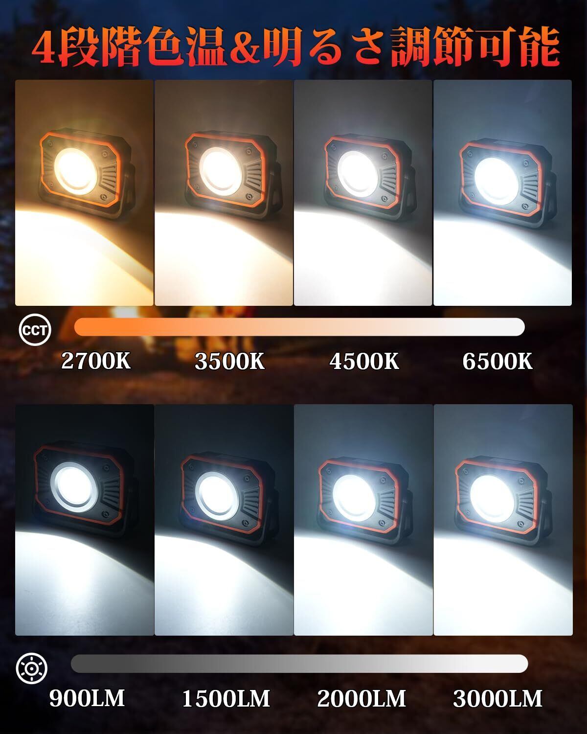 【4段階調光・調色】Kcampのワークライトが昼光色/昼白色/温白色/電球色の4色、16種類点灯モードがあります。色温調節スイッチを毎回押して、色温度の転換が可能です。また、明るさ調節スイッチを毎回押して、明るさの転換が可能です。昼光色:弱光-中光-強光-青白い光。昼白色:弱光-中光-強光-白色光。温白色:弱光-中光-強光-温かい光。電球色:弱光-中光-強光-黄色光。状況や用途に合わせて、柔らかい暖色からクールな白色光まで、細かく設定することができます!