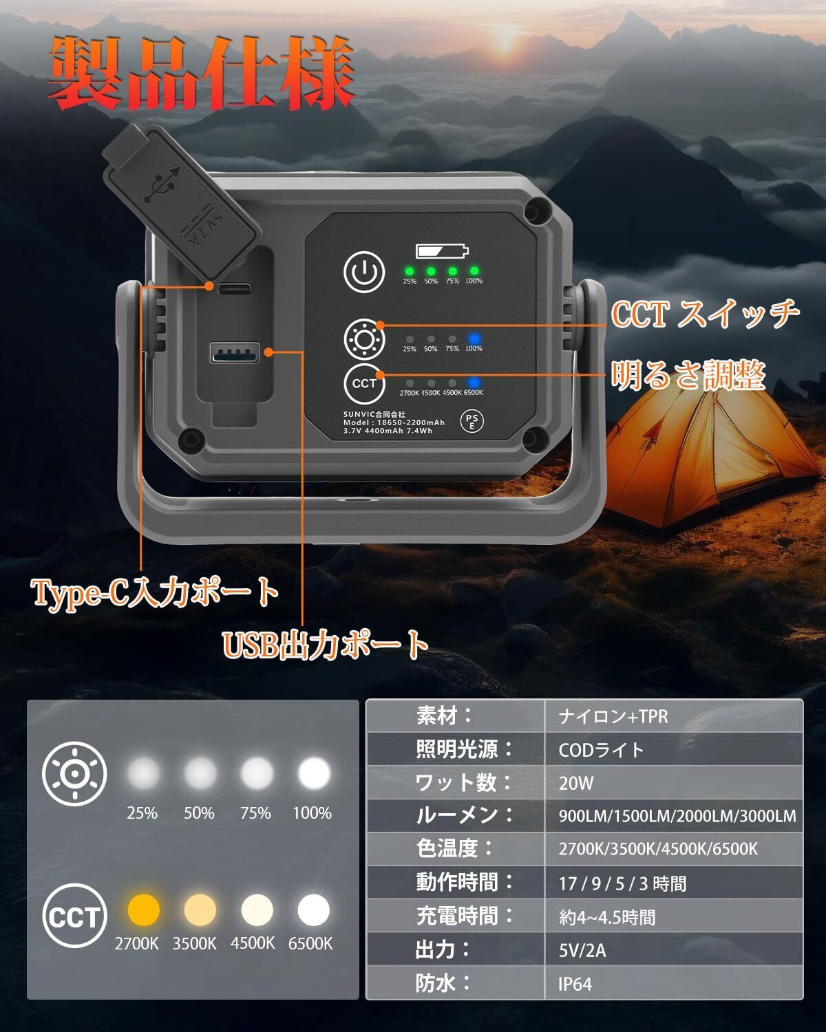 特徴 アジャスタブルライトモード, 耐衝撃性, 色温度調整可能, 軽量, 防水