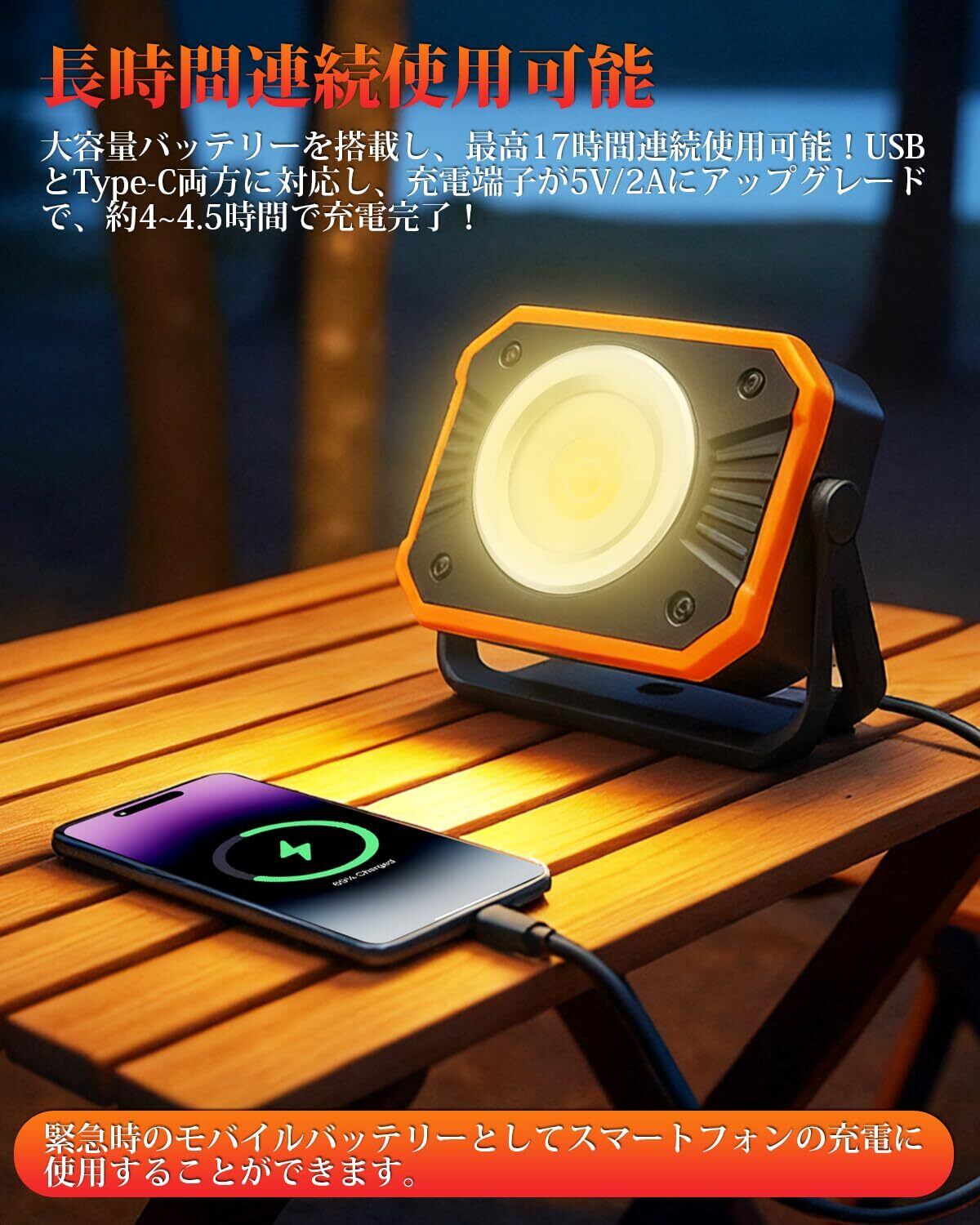 【長時間連続使用&モバイルバッテリー機能搭載】長時間使用に対応した2200mAhの大容量電池を2個搭載。フル充電時には、最小輝度で約17時間、最大輝度でも約3時間の連続使用が可能。さらに、5V/2AのUSB Type-C急速充電に対応しており、約4.5時間で充電が完了。従来の充電式投光器と比べ、充電速度は約2倍に向上しています。また、本cob作業灯はモバイルバッテリーとしても活用可能。スマホやその他USB機器の緊急充電に対応し、アウトドアや停電時、災害時などさまざまなシーンで頼もしい防災パートナーとして活躍します。充電状態とバッテリー残量は4段階のインジケーターで一目で確認でき、いつでも安心してお使いいただけます。