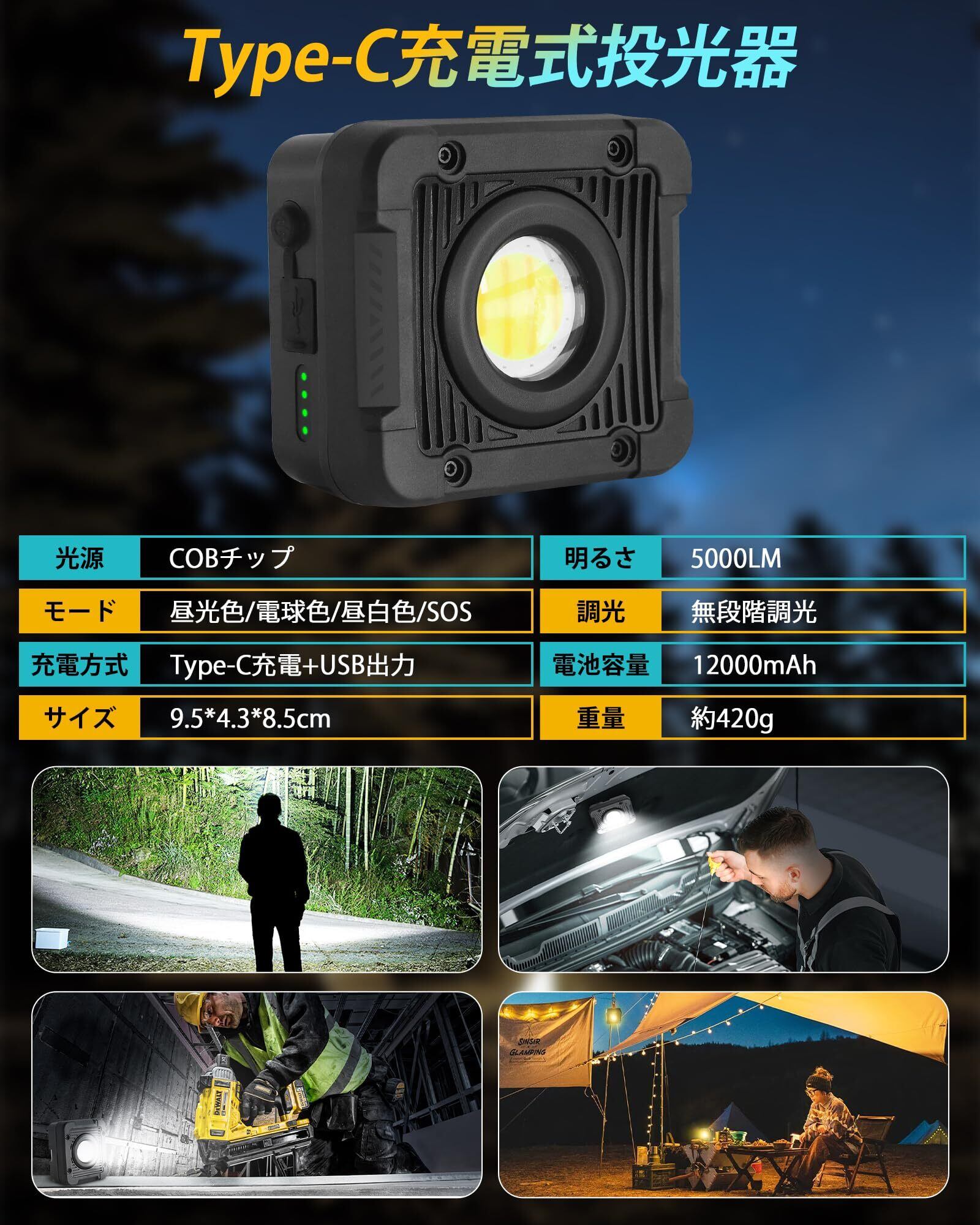 投光器 LED 充電式 作業灯【12000mAh大容量・超高輝度5000ルーメン】連続点灯168時間 無段階調光 4つ点灯モード led作業用ライト 防水 ワークライト 小型 強力マグネット モバイルバッテリー機能 屋外 アウトドア用 夜釣り 夜間工事 車の修理 夜間練習 野外照明 防災 地震 緊急 停電 非常用 PSE認証済み