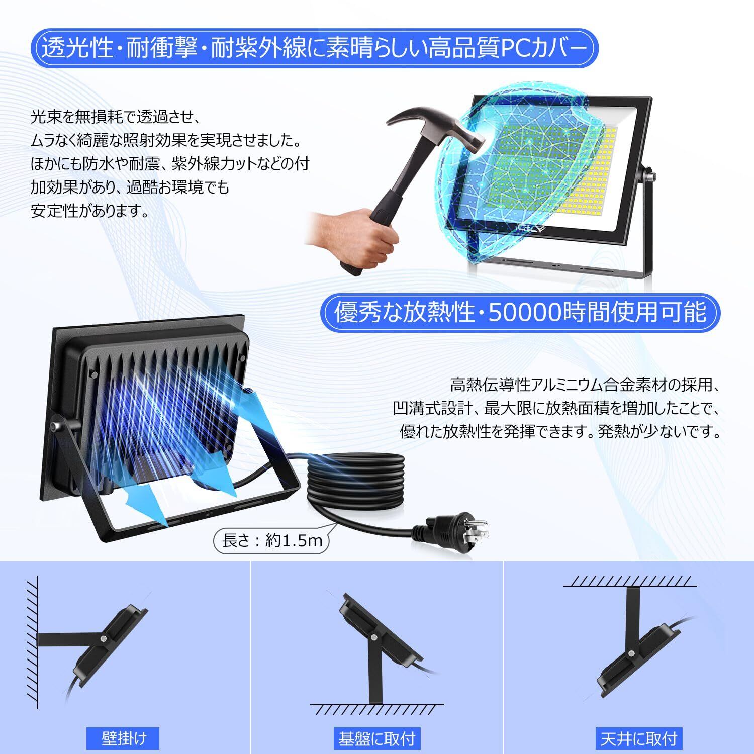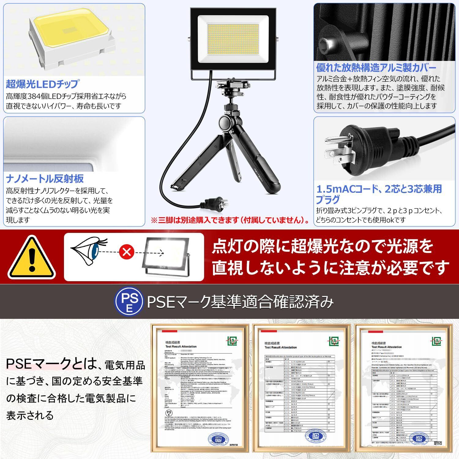 【PSE認証取得|角度調整スタンド|優れた防熱構造】このled投光器はPSE認証取得で、PSE適合の安心品質です。また、この作業灯の殻は櫛形ヒートシンクの構造で、優れた放熱性能を発揮し、LEDの寿命、効率、信頼性を最大化します。また、このライトのスタンドは上下90°の角度調整可能で、自分のニーズによって、最適な照明角度を調節することができます。壁掛け・床付け・天井などの取り付けに対応できます。普通の照明としても、作業灯としてもよろしいです。下に置くと眩しくて目に悪いので、上方で設置場所を確保する必要があります。※コンセントを入れたら一瞬間で点灯するため、直視すると光が目に焼き付くくらい明るいので、使用する時に、発光面は自分に向けないでください。コンセントを挿すと点灯抜くと消灯のシンプルな作りですので、使用するのは便利です。また、もし必要があれば、スイッチが無いのでスイッチ付きコンセントを付けて使うことができます。