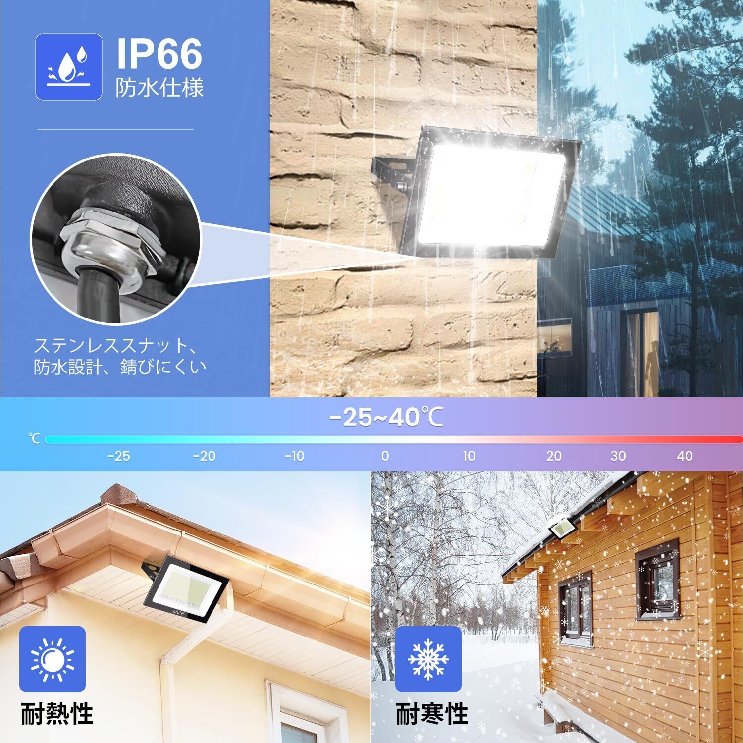 【IP66防水仕様|屋内/屋外使用可、様々な場所に活躍します】この投光器はIP66の防水レベルで屋外・屋内両方ともご利用okです。耐水性が高い、豪雨や台風などの場合の見事にお使いになれます。でも、長時間に水に浸すことはダメです。様々な用途で使用予定ことができます。バーベキュー時の明かり、夜の作業灯として、夜間スポーツ練習用、町内の防犯灯として、写真撮影のライトとして、持ち運びもしやすく固定場所も融通が効くので使いやすいです。また、壁面照明、工場の手元を照らす、車庫内の照明、ガレージの照明、看板照明、倉庫照明、体育館、建物の外構、景観照明、屋外作業場、駅、取付け場所も道路、外構照明、店舗壁面の照明、街路照明などの照明に使用されます。また、スポーツ競技の夜間照明や、広場・駐車場、建物をライトアップレ夜間景観を演出します。