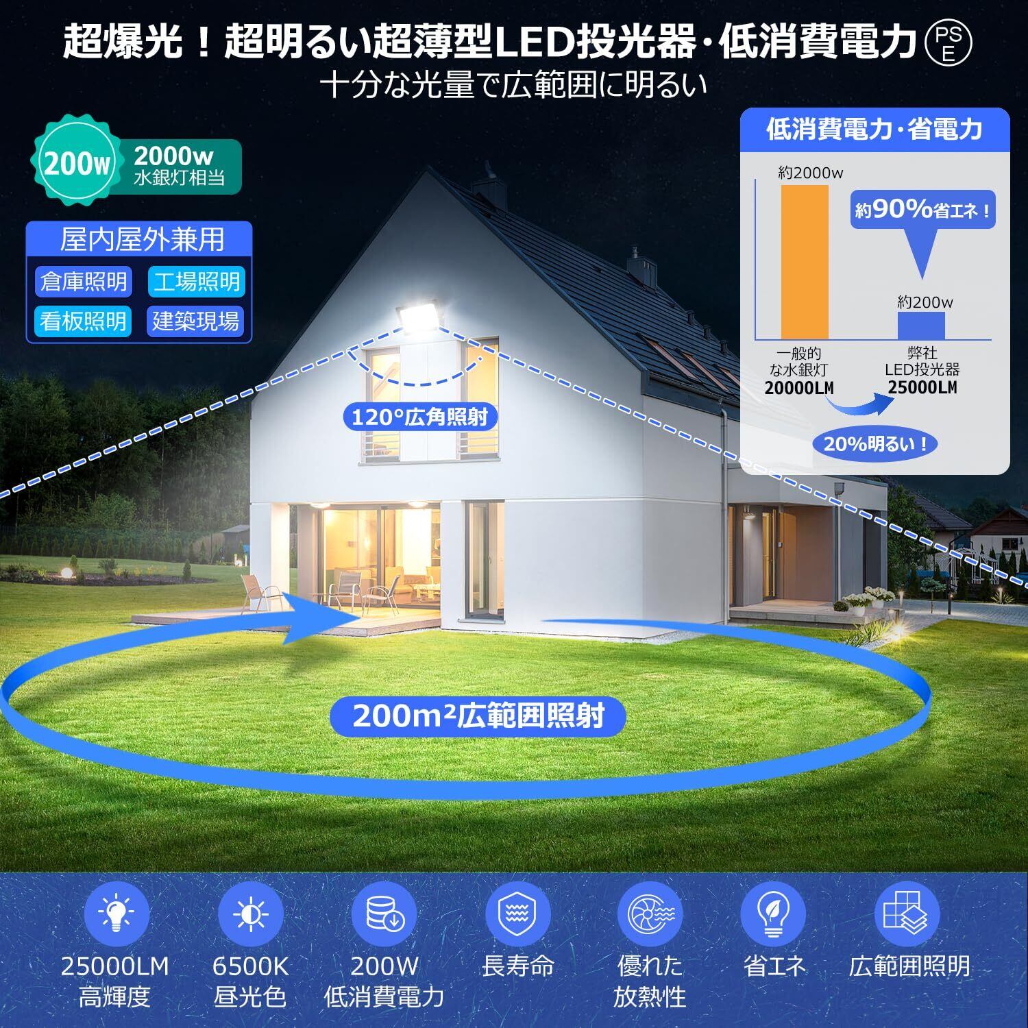 【数量限定】投光器 屋外 LED 作業灯 200W 昼光色 IP66防水6500K 25000LM 2000W相当 ワークライト 集魚灯 看板灯 フラッドライト【超爆光 超薄型 高輝度 広範囲 省エネ 5万時間の寿命】作業用 駐車場 倉庫 防犯灯 BBQ 工場 工事用 カーポート ガレージ 外灯(2個)【AC100V 2芯と3芯併用プラグ PSE認証取得 2年間品質】