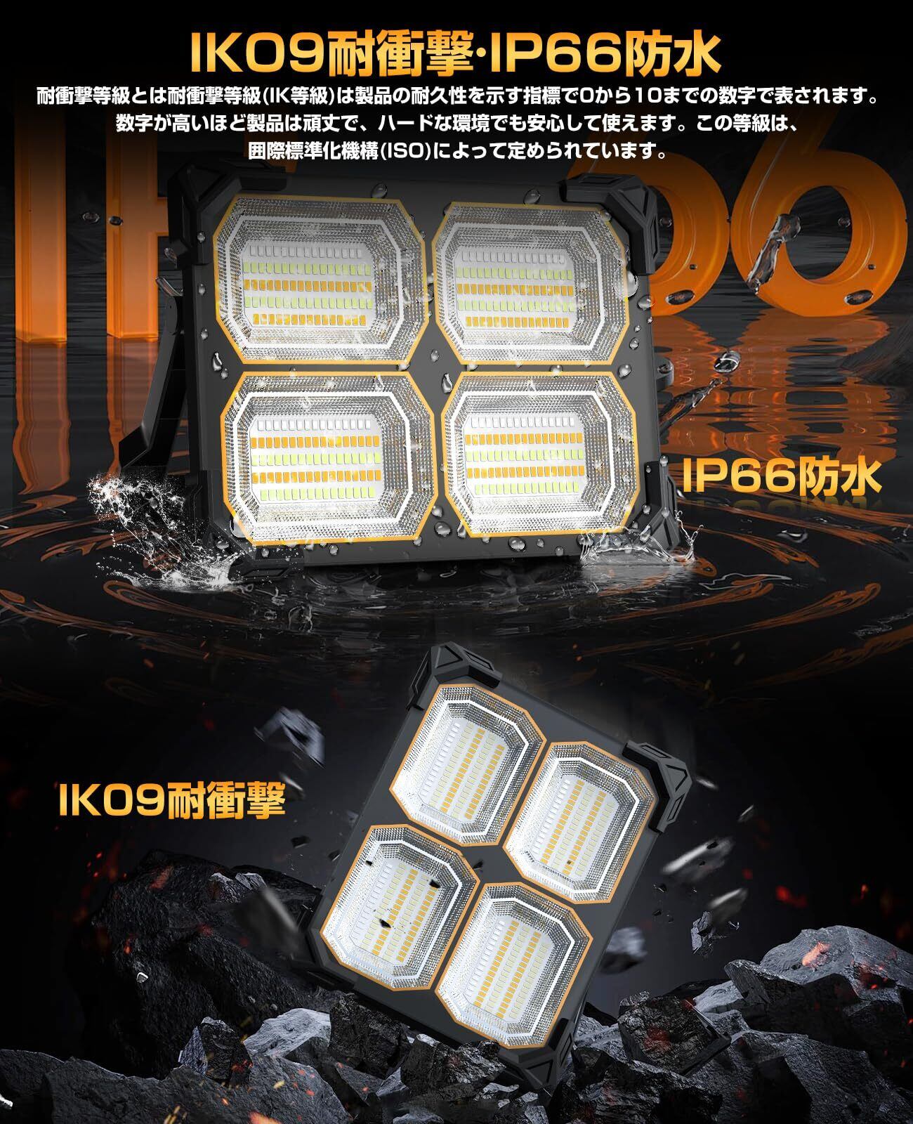 【IKO9耐衝撃・IP66防水・頑丈な構造・高性能放熱設計】耐衝撃等級とは耐衝撃等級(IK等級)は製品の耐久性を示す指標で0から10までの数字で表されます。数字が高いほど製品は頑丈で、ハードな環境でも安心して使えます。この等級は、囲際標準化機構(ISO)によって定められています。TANKAOのLED投光器は強化超透明ガラスと滑り止め保護カバーを採用しており、防爆、耐圧、高温耐性があり、光透過率が大幅に向上し、光効果が向上し、落下や衝撃にも耐える耐久性を備えています。サメのエラを模したスマート放熱設計を組み合わせて、迅速で効率的な放熱をしします。これにより、過酷な屋外環境においても、良好な性能と長寿命をします。雨や雪の日でも正常に使用できます(水に浸さないでください)。