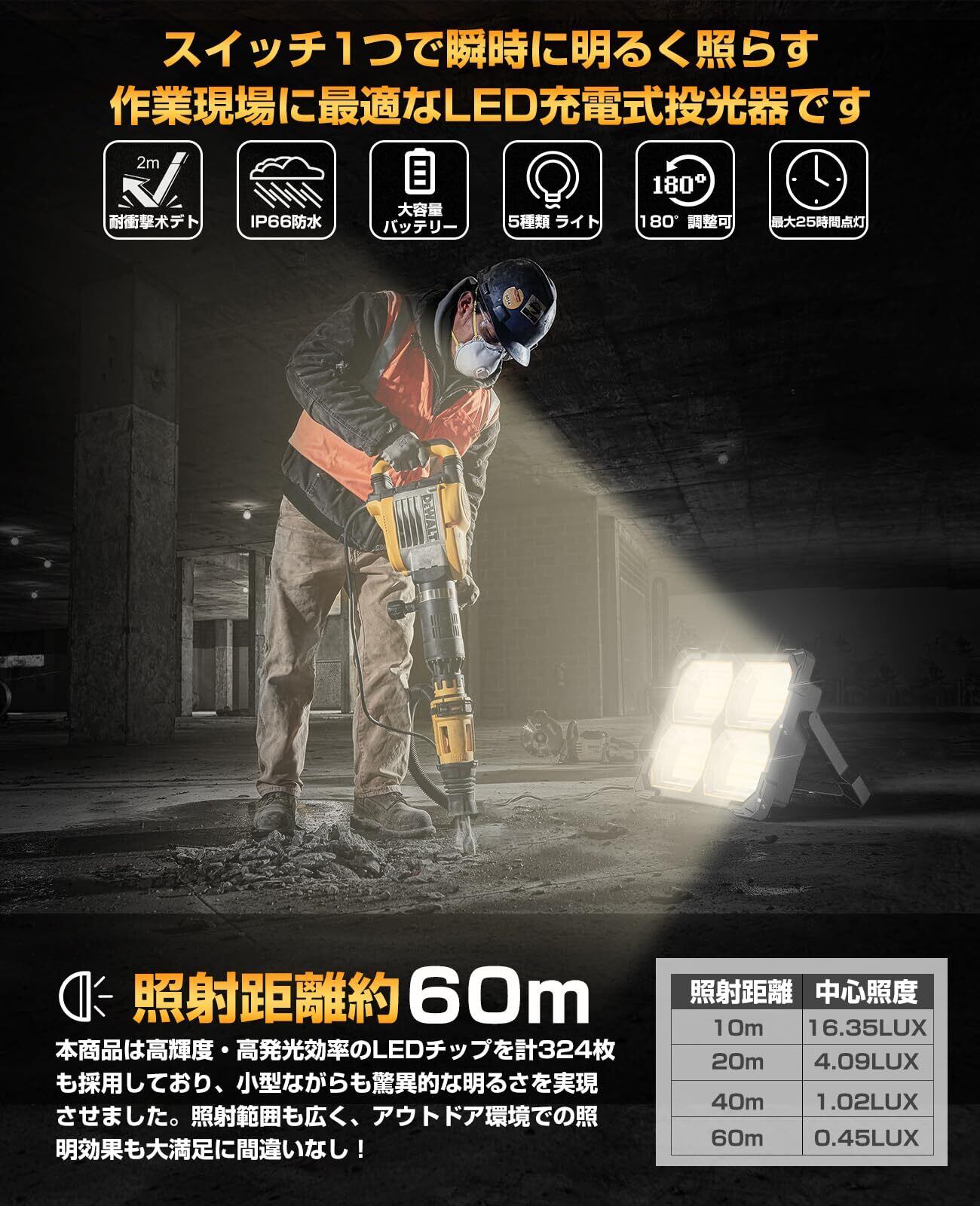 【26000mAh大容量バッテリー・最大25時間連続使用が可能】新世代のLEDライトは使用寿命500,00時間以上に達し、周囲の暗闇を切り開き、夜間であっても昼間のように感じられます。サイズ:Φ230*190*60mm 重量:約2kg(単品) 26000mAh大容量リチウムバッテリーを内蔵しており、電池交換の手間が無し。50%自然色モードで25時間以上、100%自然色モードで15時間連続使用可能!フル充電後、最大約25時間の連続稼働ができます(乾電池次第)。また、USB充電式なので、ACアダプター、モバイルバッテリーなどを利用し、手軽に充電ができます。充電して何回も使える充電式は、環境への 負荷を抑えることができるからです。充電式 led投光器としては、どこでも楽々で持ち運びやすくて、充電が長持ちで週末一泊二日のアウトドア用も安心して使えます。注意事項:ご使用前に完全に充電してください。
