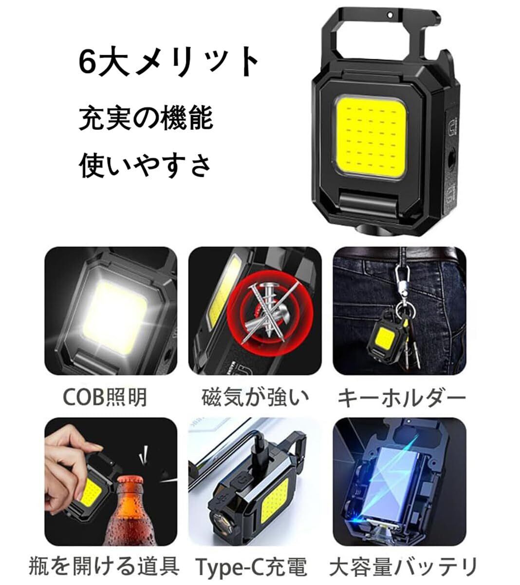 【ポータブルCOBミニキーホルダーライト】小型で軽量で、保管や持ち運びに便利です。小型なのに凄い明るさ、1000ルーメンをえる高輝度で、5つの点灯モードを備えています、栓抜きとしても使える