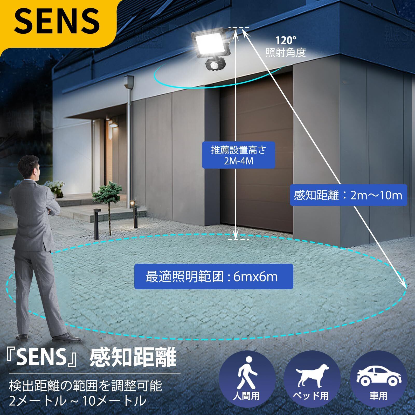 【便利な人感センサー機能】人感センサーが搭載されており、人の動きを感知すると自動的に点灯します。感知範囲内で動作が検知されると、手動操作の必要なく点灯するため、暗い夜道や玄関前、駐車場での利便性が大幅に向上します。防犯対策にも効果的で、センサーライトが自動的に点灯することで、不審者の侵入を防ぐ抑止効果も期待できます。