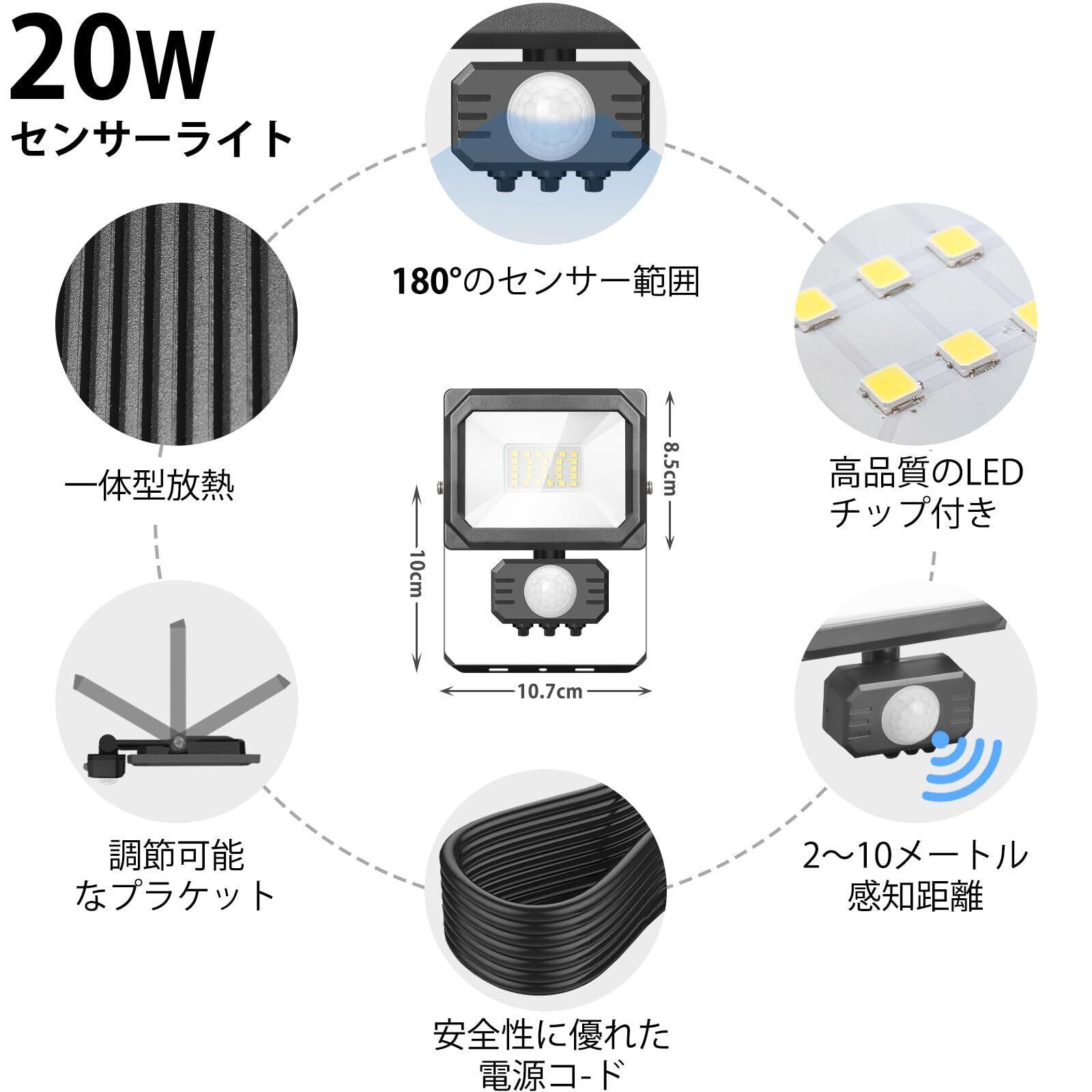 LED投光器 センサーライト 人感ライト 20W 節電 2Pプラグ付き コンセント式 AC100V 3Mコード 屋内/屋外用 IP65 120度照射角度 防雨 高輝度 省エネ 庭 駐車場 玄関灯 廊下 町内の防犯 PSE認証済