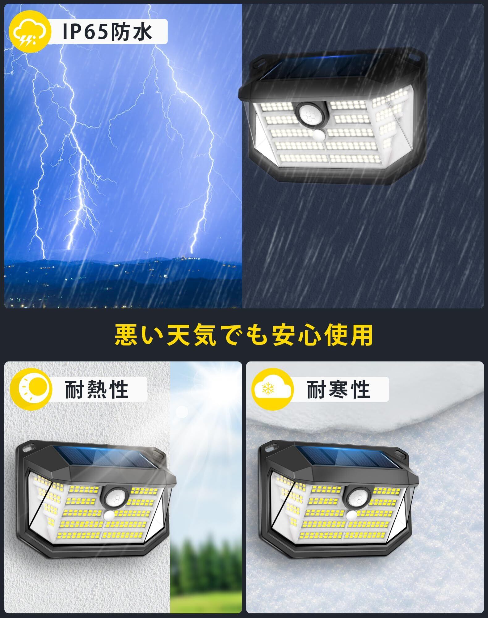 【IP65高水準防水性&設置簡単】ソーラーライトにはIP65高水準防水防塵技術採用して、雨や雪・霧などの厳しい気象条件にも耐えられるようになっています。使用寿命を延ばすために、高品質ABS材質で作られており、耐衝撃性・安定性・耐食性などに優れています。パネル一体型なので配線などもなく、ネジ(付属)や両面テープ/バンド(別売り)などで簡単に設置することができます。