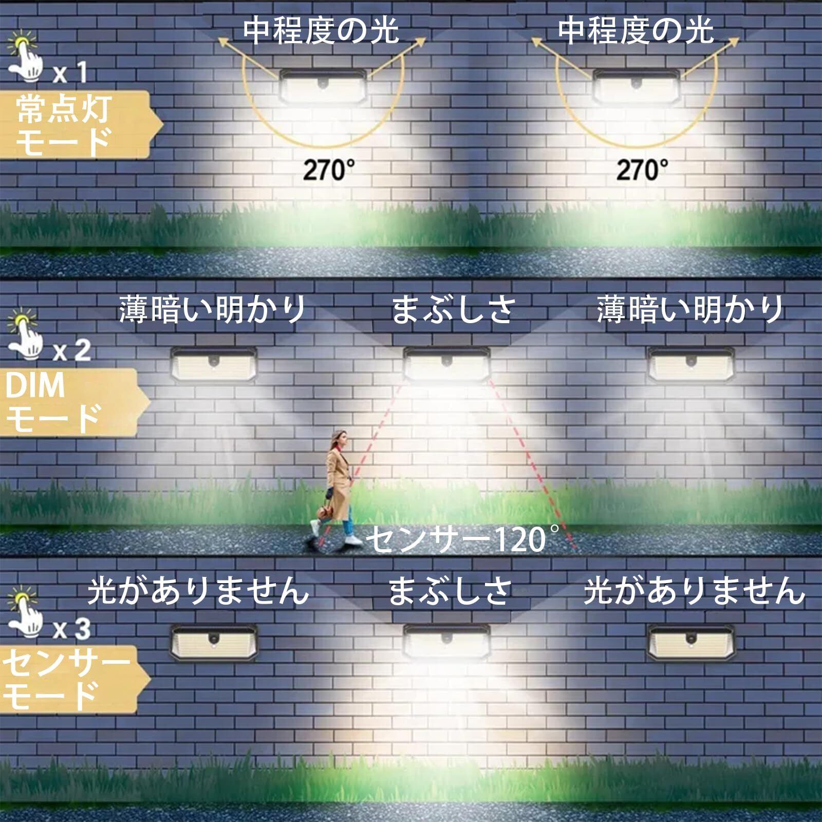 【三つ照明モード搭載したソーラーライト】このガーデンライトは常時点灯モード、DIMモード、強光センサーモードがありまして、一回目押すると【常時点灯モード】になる:夜または暗くなると自動的に中程度の明るさで点灯します。二回目ボタンを押しすると【DIMモード】になる:夜や暗くなると、自動的に弱光点灯します。 動きを検知すると、15秒間100%の明るさで点灯し、再び暗くなります。三回目ボタンを押しすると【強光センサーモード】になる:夜間に動きを検知すると、100%の明るさで15秒間点灯し続け、その後自動的に消灯します。