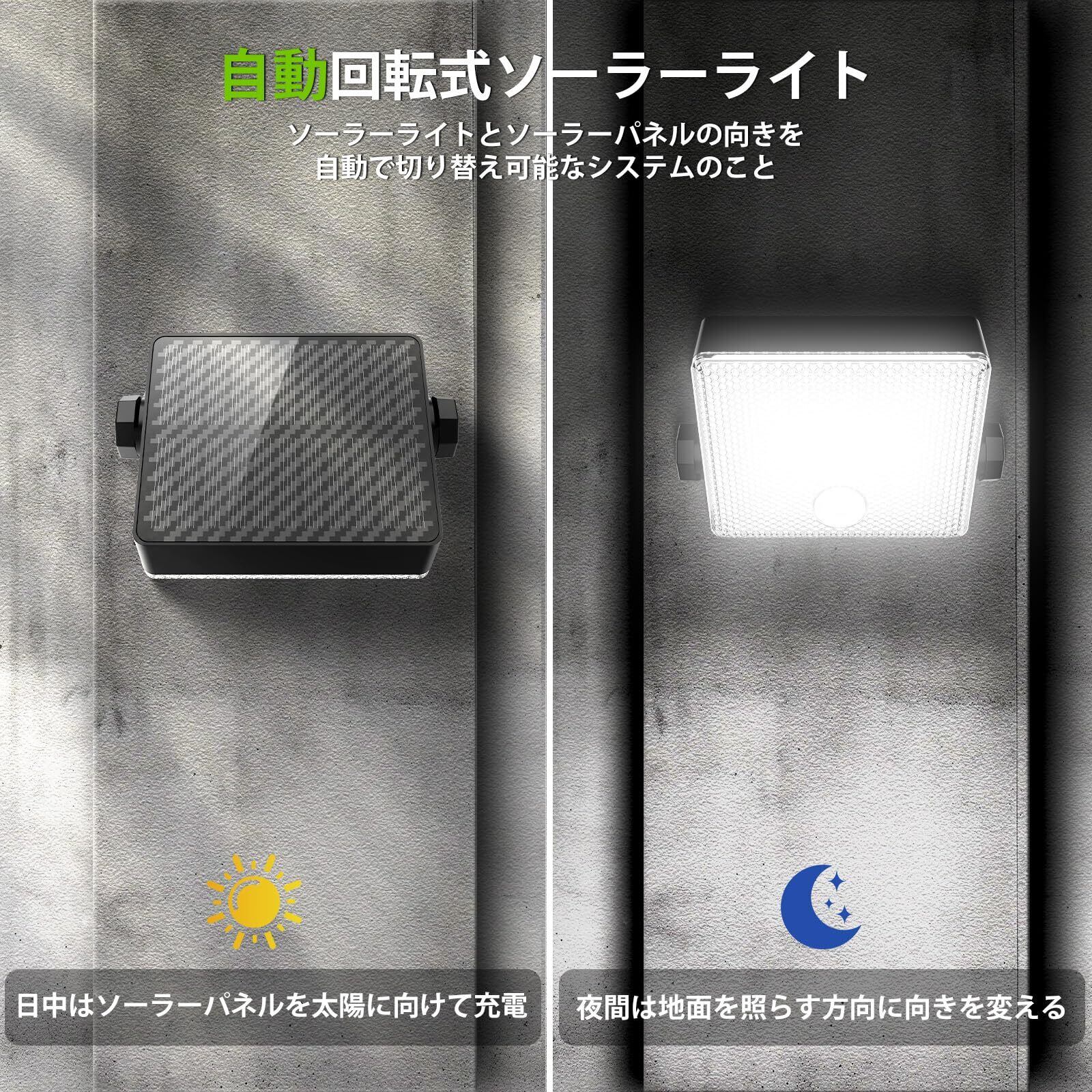 ソーラーライト 屋外 防水 【自動回転式】 人感センサーライト 高輝度 自動夜間点灯 防犯ライト 3つ知能モード 2200mAhバッテリー 炭素繊維ソーラーパネル IP65防水 センサー照明 壁掛け ガーデン 庭園 玄関 駐車場 防災 停電時適用 1個