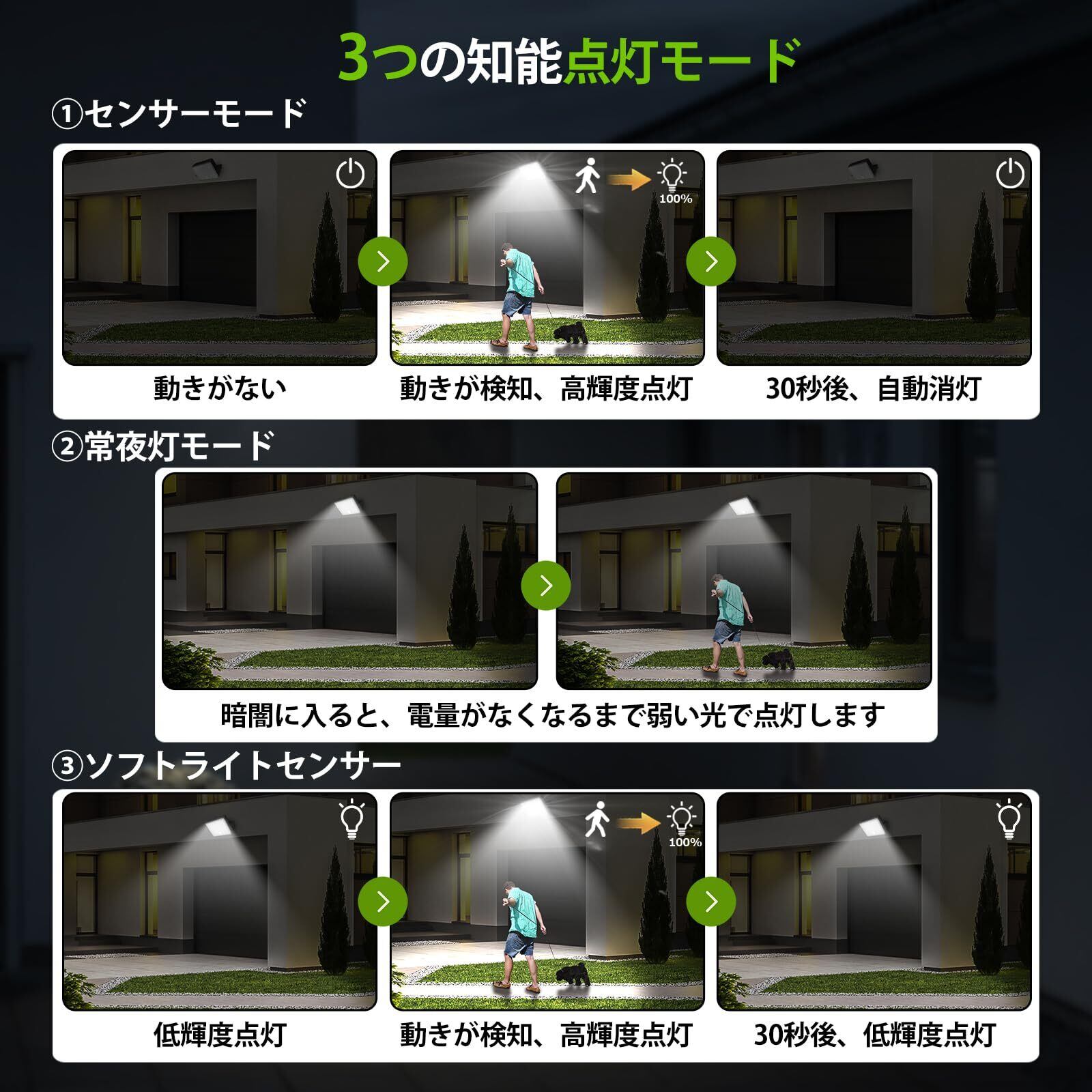 【三つのセンサーモード】この屋外用センサーライトはお客様のニーズに応じてお選びいただける3つの点灯モードを搭載しております。センサーモード:闇になっても点灯なし。動きを感じされると強い光になり、30秒後、消灯状態になります。常灯モード:暗闇に入ると、電量がなくなるまで弱い光で点灯します。DIMモード:闇に入ると弱い光で点灯します。動きを感じされると強い光になり、30秒後、弱い光に戻ります。