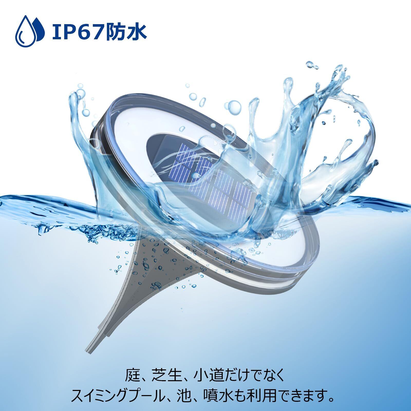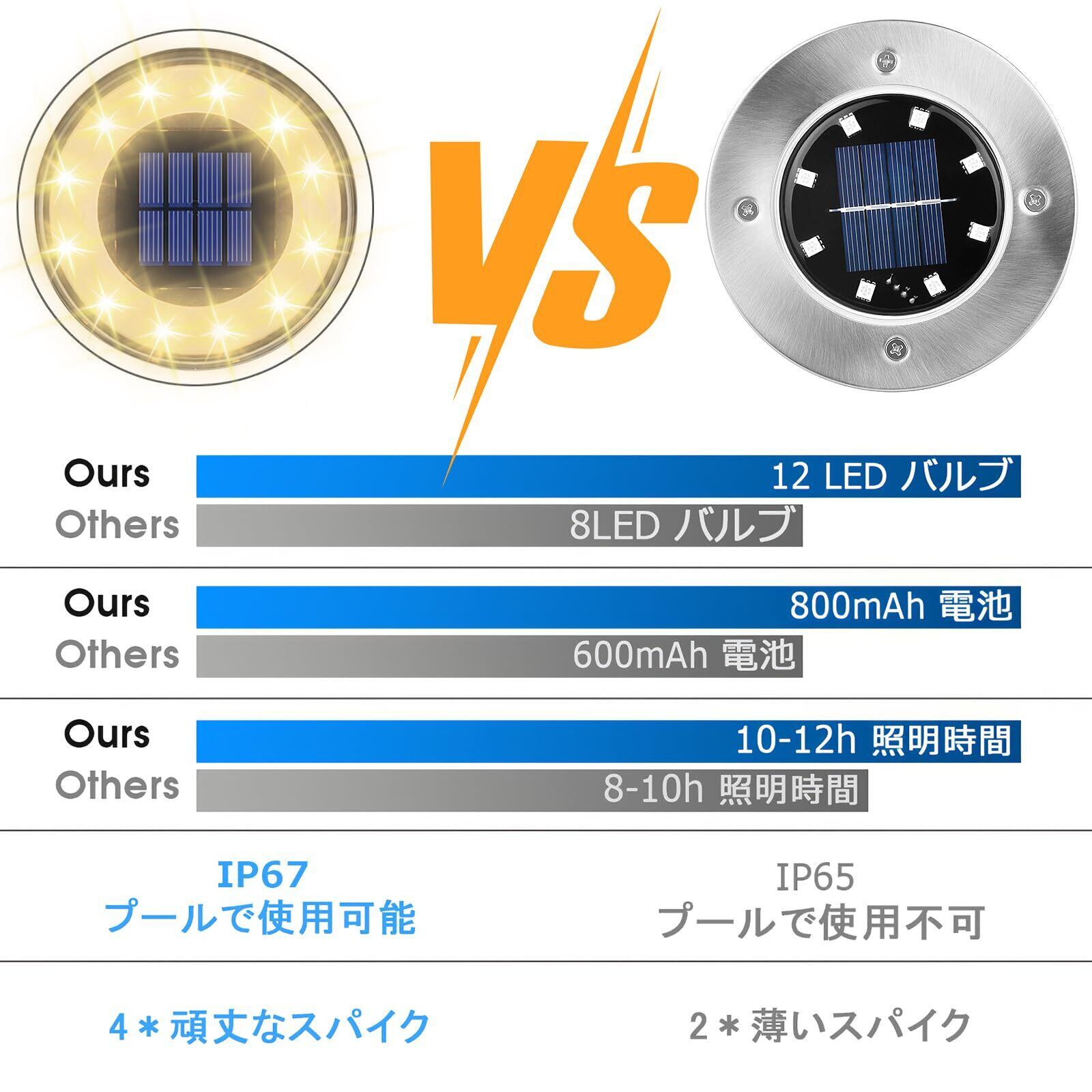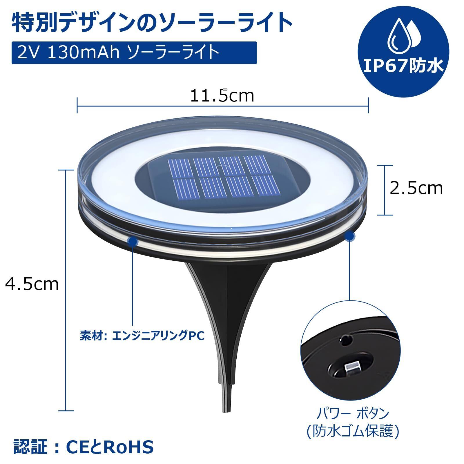 LED ソーラーライト材質はPP+PSで、HDレンズの材質は光透過率が優れています。8個高品質LEDが揃え、発光効率の高い上に、360°全方向を照らせ、光射範囲は広いです。強度が強くて傷つき難い素材で車が踏んでも問題ありません、耐荷重は180kgで安定してご使用いただけます!電球色のやわらかい光が庭を華やかにして、庭の雰囲気がぐっとおしゃれになり、庭がワンランクアップ!